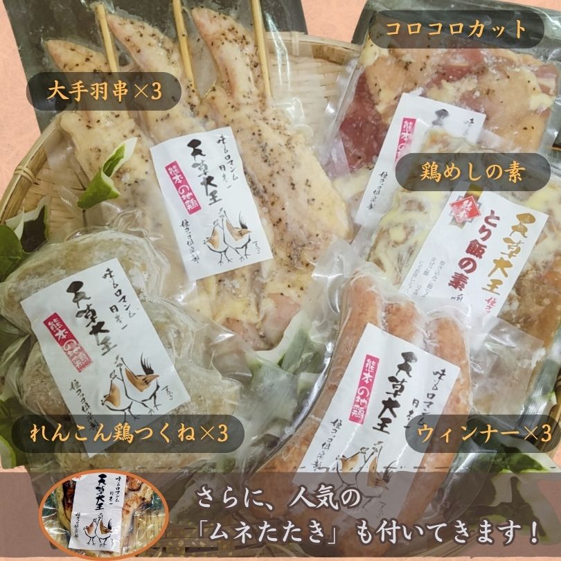 ※商品内容:大手羽串3本、れんこん鶏つくね3個、コロコロカット、鶏めしの素、ウィンナー3本、ムネたたき