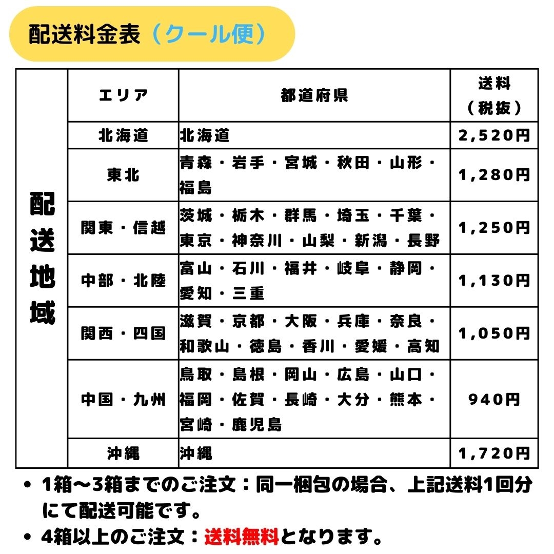 こちらの商品はクロネコヤマト冷凍便(60サイズ)で3個まで配送可能です。4個〜のご注文で送料無料となります。