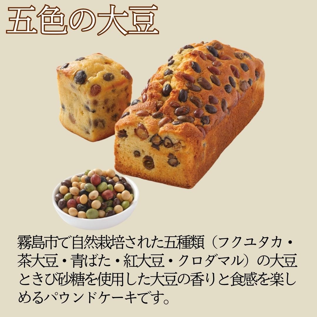 ・霧島市で自然栽培された五種類(フクユタカ・茶大豆・青ばた・紅大豆・クロダマル)の大豆ときび砂糖を使用した大豆の香りと食感を楽しめるパウンドケーキ「五色の大豆」