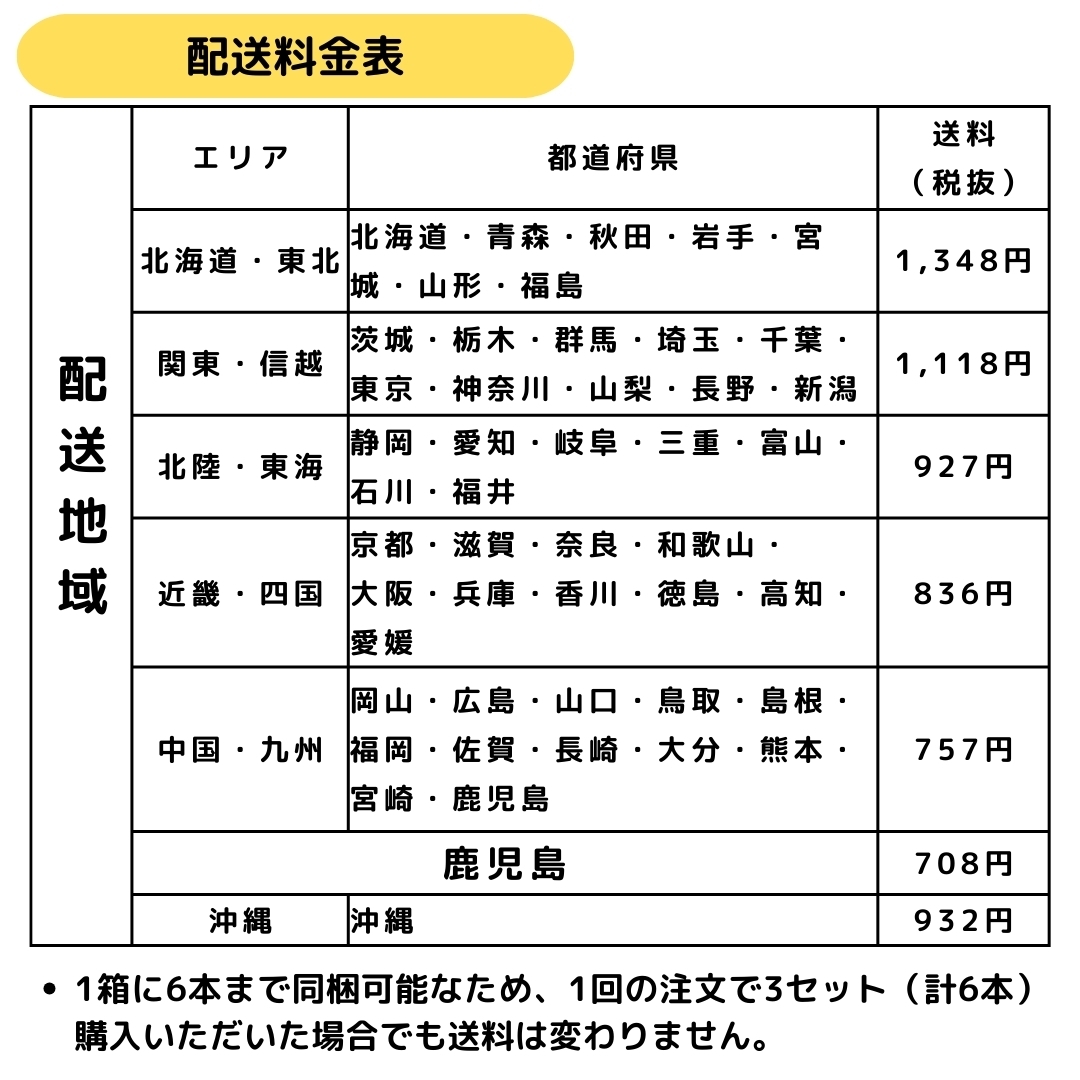 ※1箱に6本まで同梱可能なため、1回の注文で3セット(計6本)購入いただいた場合でも送料は変わりません。