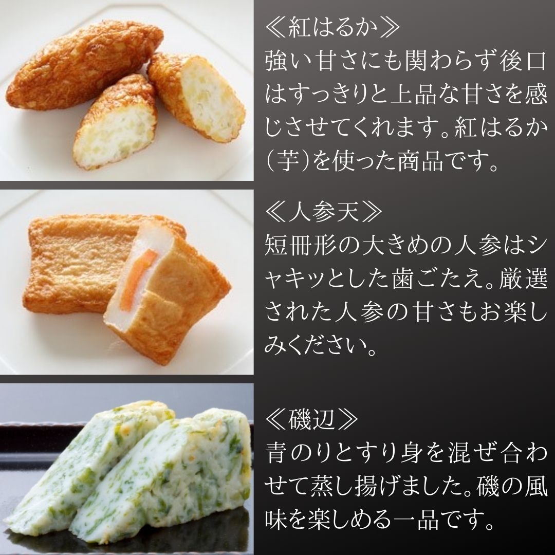 棒天×3、飛魚天×3、メンタイ天×3、ごぼう天×4、山菜天×4、梅しそ天×2、紅はるか×2、人参天×3、磯辺×2、季節天A×2、季節天B×3