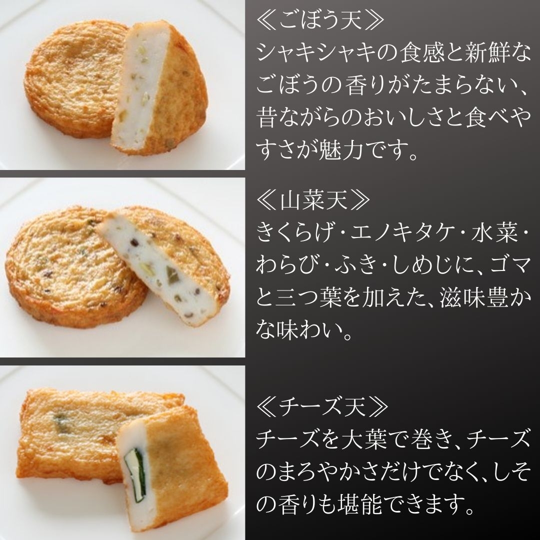 棒天×4、飛魚天×4、メンタイ天×4、ごぼう天×5、山菜天×5、チーズ天×2、梅しそ天×2、紅はるか×2、人参天×3、帆立×2、季節天A×2、季節天B×3