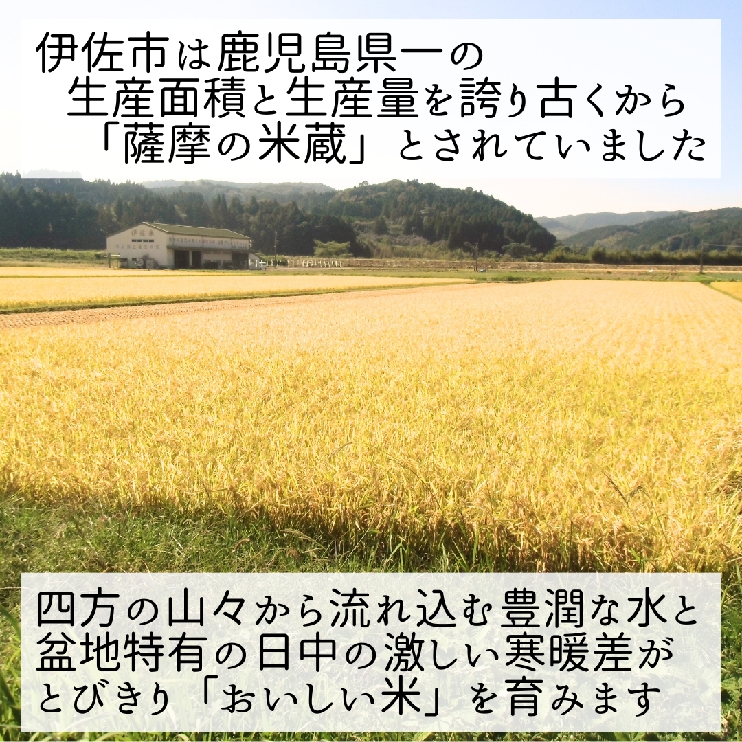 鹿児島県一の生産面積と生産量を誇り、古くから「薩摩の米蔵」とされている伊佐市は、四方の山々から流れ込む豊潤な水、盆地特有の寒暖差の激しい環境がとびきり「美味しい米」を育み、恵まれた自然環境で「安心・安全」で土づくりからこだわったお米づくりに励んでいます。