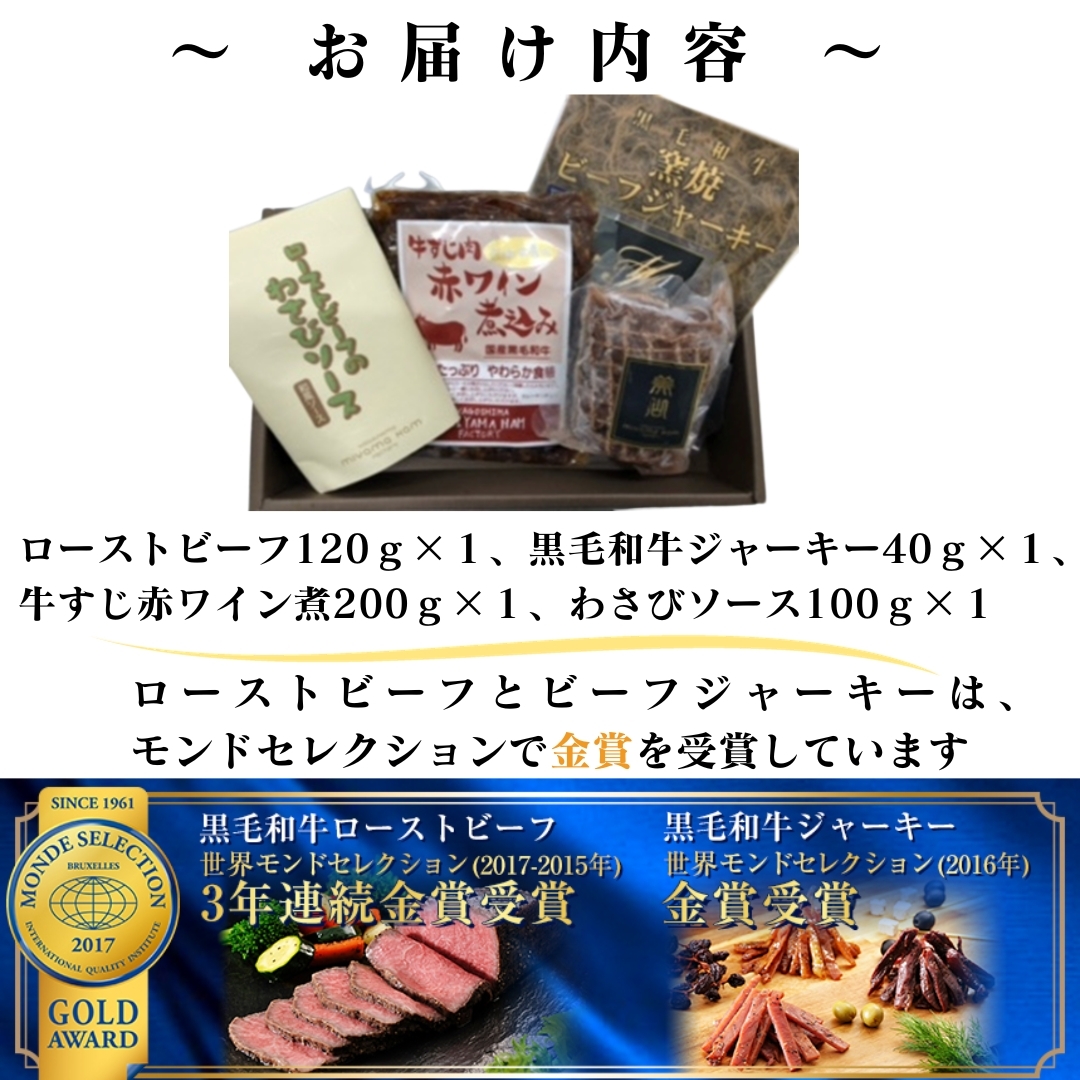 国産黒毛和牛を贅沢に使用した新食感ジャーキー、黒毛和牛の牛すじを贅沢に煮込んだ国産牛すじ赤ワイン煮、柔らかくジューシーな深い味わいのローストビーフ、ローストビーフにつけてお召し上がり頂くわさびソースの詰合せセット。