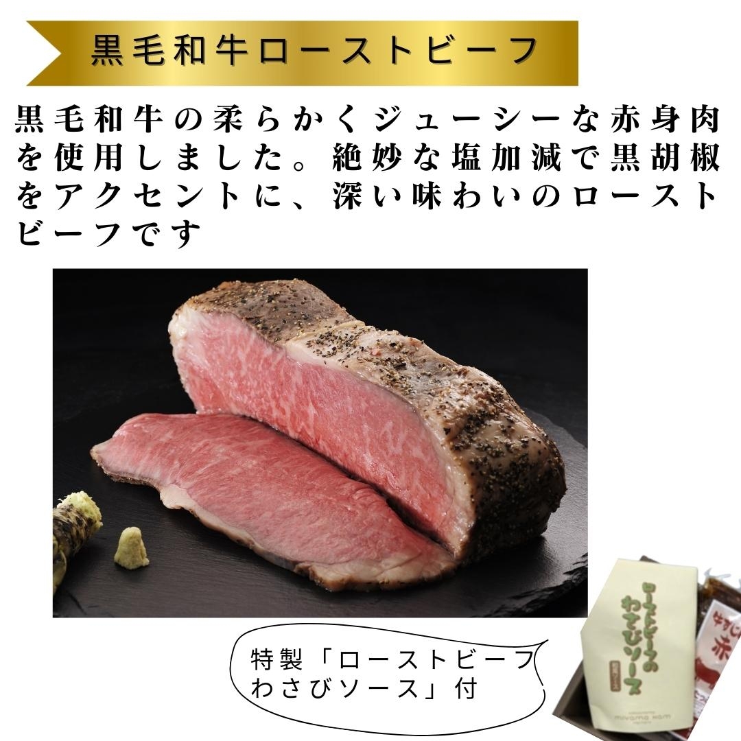 柔らかくジューシーな赤身肉を絶妙な塩加減で黒胡椒をアクセントに、深い味わいの黒毛和牛ローストビーフ。ボロニアソーセージは、豚もも肉をメインに使った昔ながらのソーセージです。