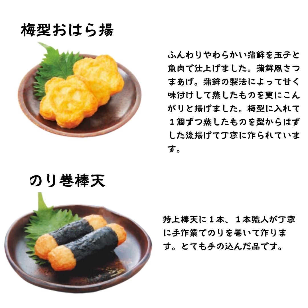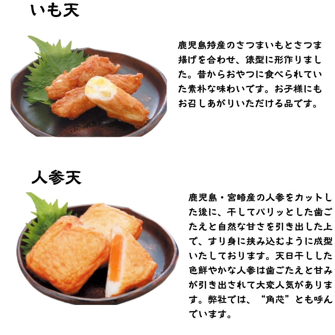 原材料名:魚肉(スケソウダラ(アメリカ産)、シロガネダラ、イトヨリダイ、エソ、イワシ)小麦澱粉、本みりん、砂糖、食塩、地酒(鹿児島県製造)、牛蒡、人参、さつまいも、きくらげ、枝豆、レンコン、のり、しそ、生姜、白ごま、なたね油/調味料(アミノ酸等)、保存料(ソルビン酸)、着色料(クチナシ色素)、(一部に小麦・卵・乳成分・大豆・ごまを含む)