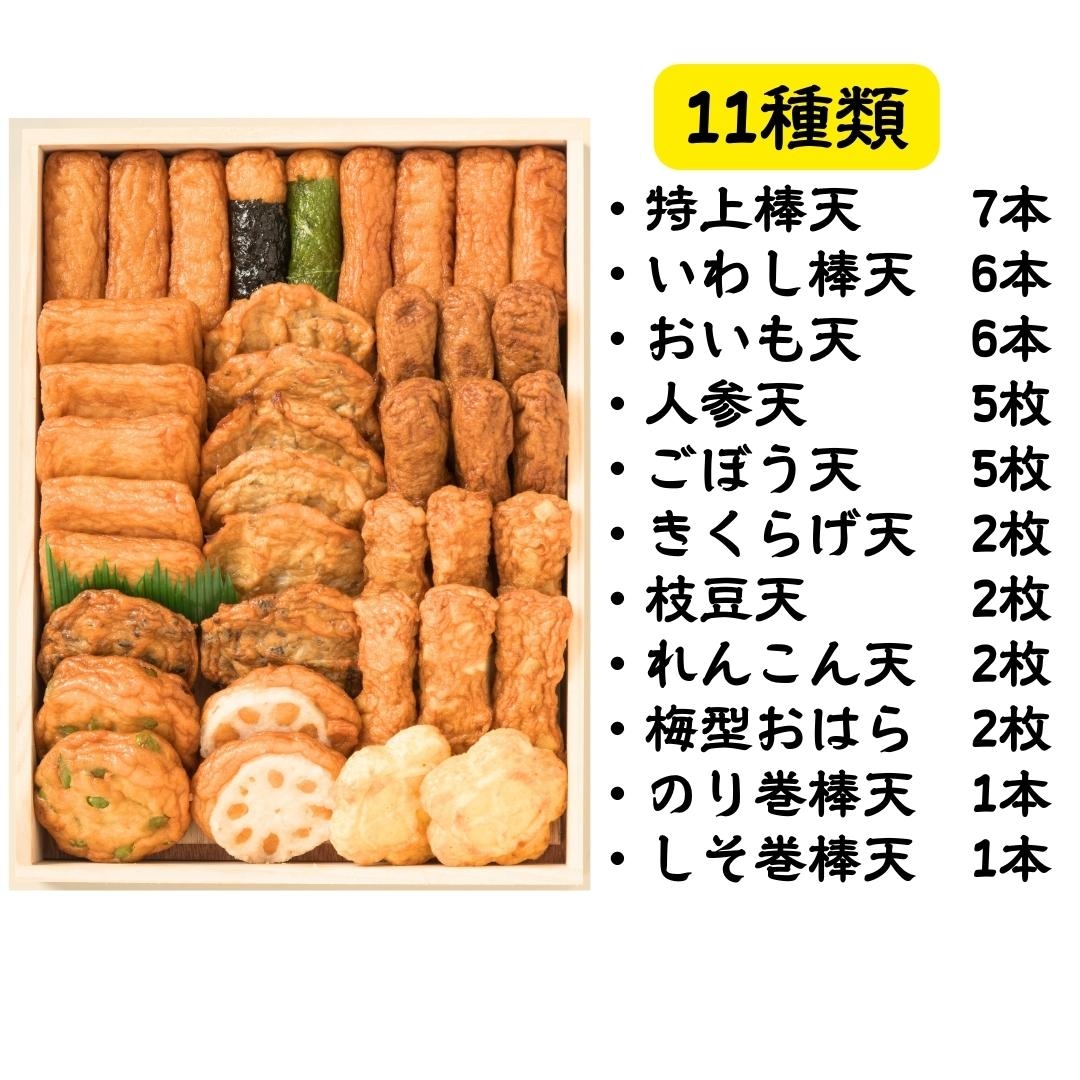 こちらの商品は11種類/39個のさつま揚げが入っております。