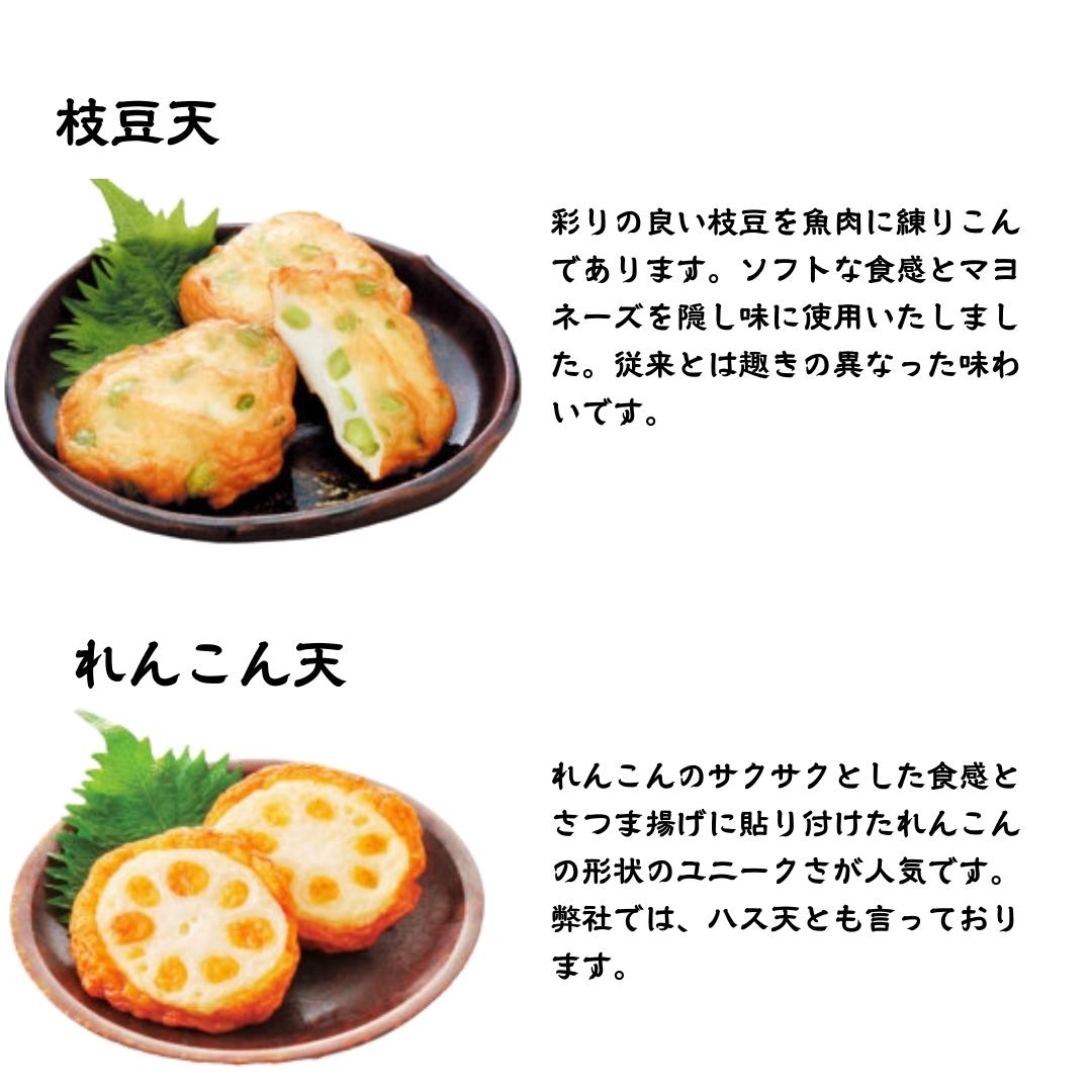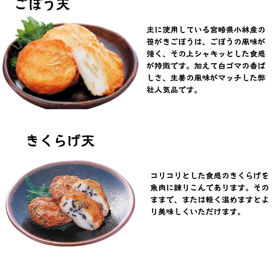 原材料名:魚肉(スケソウダラ(アメリカ産)、シロガネダラ、イトヨリダイ、エソ、イワシ)小麦澱粉、本みりん、砂糖、食塩、地酒(鹿児島県製造)、牛蒡、人参、さつまいも、きくらげ、枝豆、レンコン、のり、しそ、生姜、白ごま、なたね油/調味料(アミノ酸等)、保存料(ソルビン酸)、着色料(クチナシ色素)、(一部に小麦・卵・乳成分・大豆・ごまを含む)