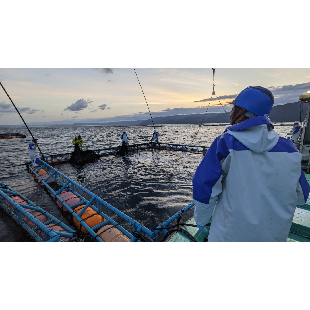 給餌飼料メーカーと共同で開発したオリジナルの餌は低魚粉で栄養価が高く環境にもやさしい餌で、ブリの鮮度保持と品質の安定に寄与しています。