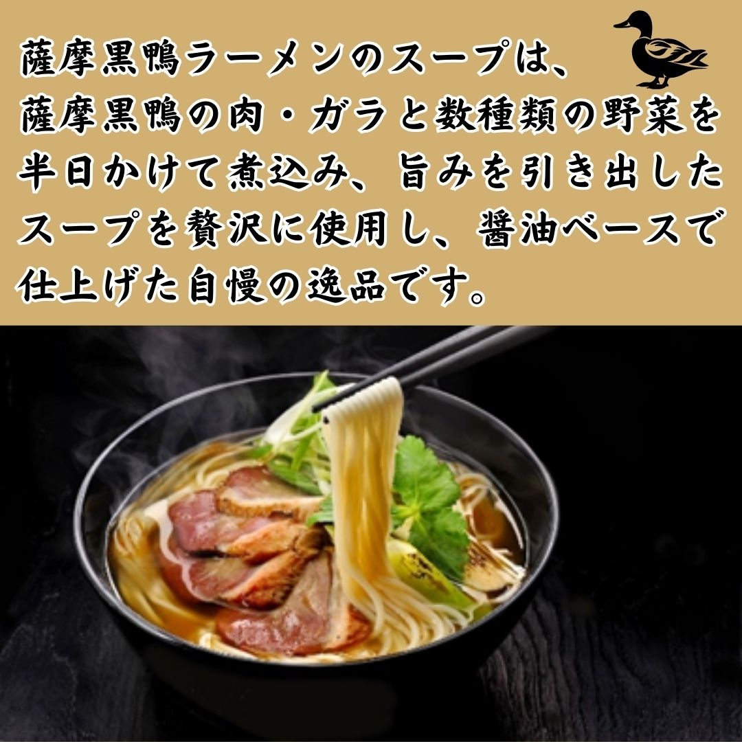 スープ:しょうゆ(国内製造)、鴨肉エキス(薩摩黒鴨)、チキンエキス、鶏脂、発酵調味料、食塩、豆板醬、酵母エキス、生姜ペースト、ごま油、砂糖、ねぎ粉末/加工でんぷん、(一部に小麦・大豆・ごま・鶏肉を含む)