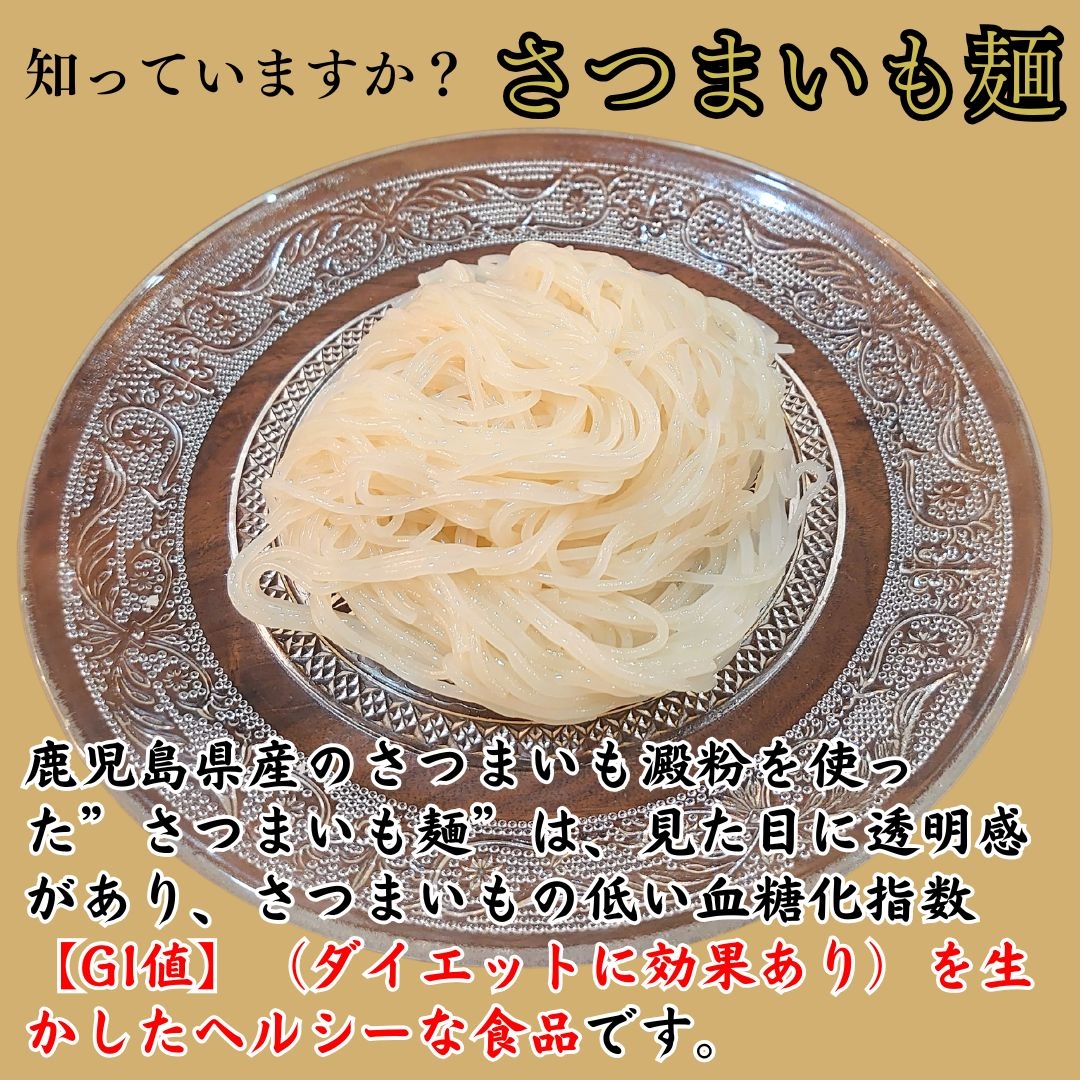 さつまいも麺は鹿児島県農産物指導センターが約5年かけて研究開発し、技術移転され商品化された麺です。原料品種は主にシロユタカ、コガネセンガン。
