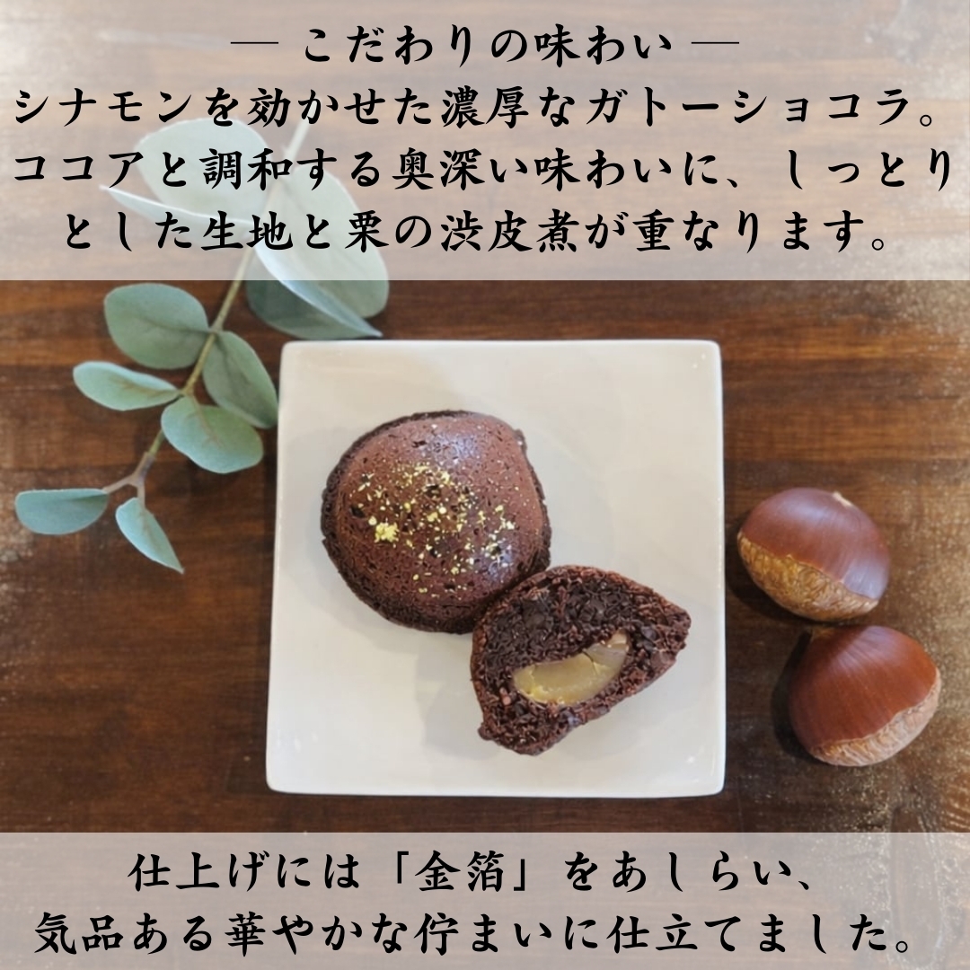 濃厚なチョコレートに栗の風味を閉じ込め、想いを込めて焼き上げたガトーショコラです。