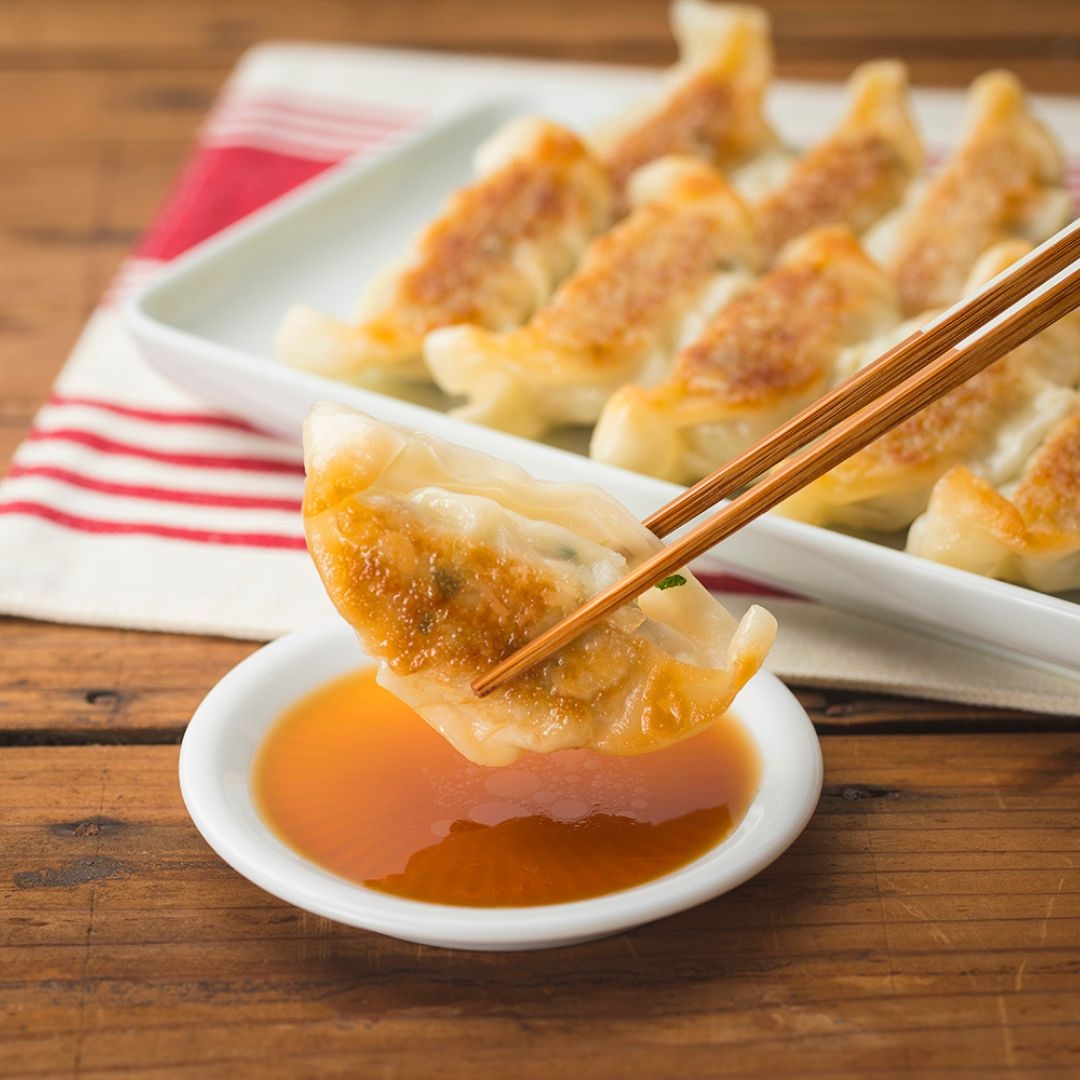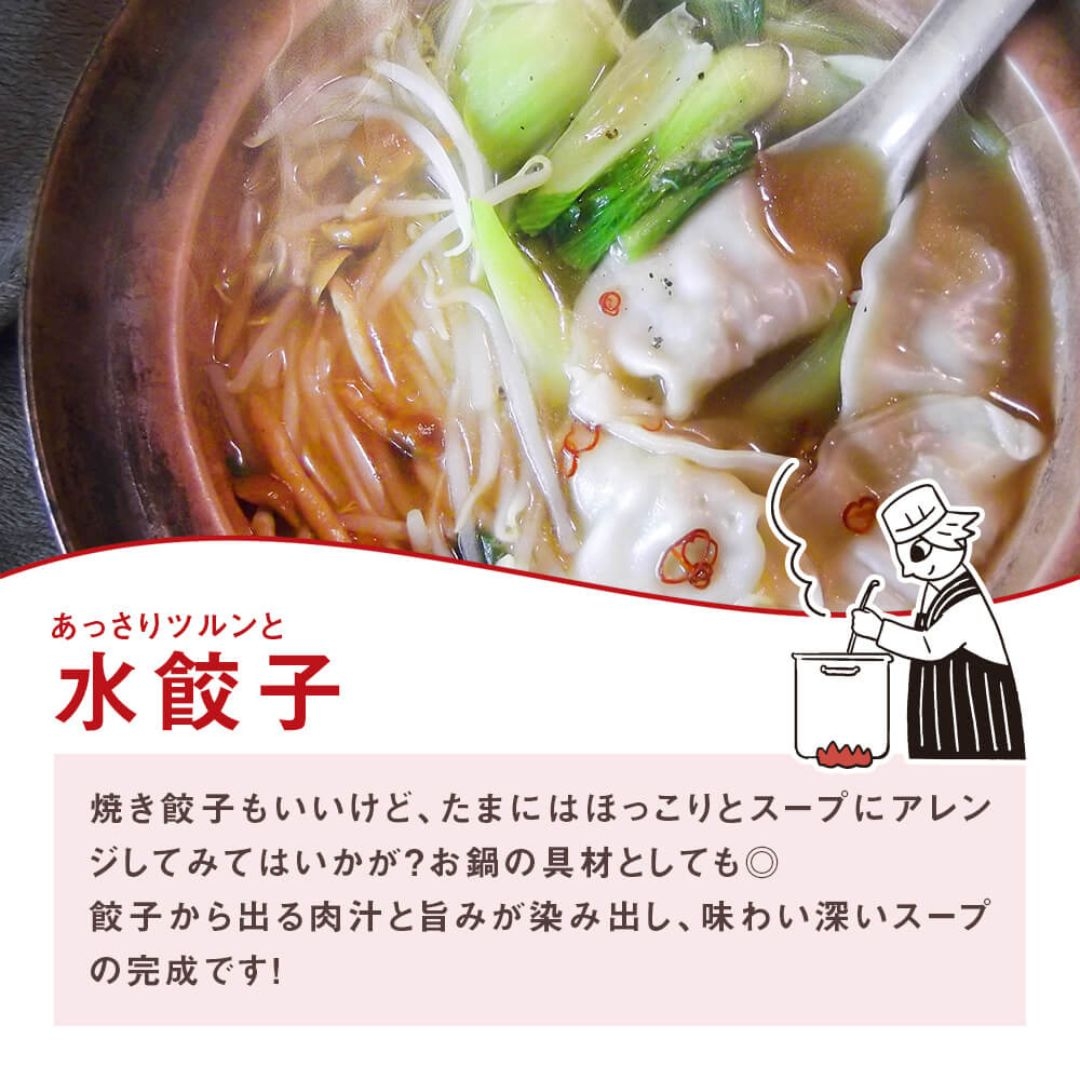 餃子[野菜(国産(キャベツ、玉ねぎ、ニラ、ネギ、ニンニク))]、豚肉、豚脂、でん粉、豚・鶏エキス、食塩、ごま油、鰹エキス、醸造酢、砂糖、料理酒、胡椒、ポーク香味シーズニング、みりん風調味料、椎茸パウダー、唐辛子、皮(小麦粉(国内製造)、小麦たん白、粉末油脂、食用植物油脂、食塩)、/加工でん粉、調味料(アミノ酸等)、酒精、炭酸Ca、pH調整剤、香辛料抽出物、酸味量、(一部に小麦、乳成分、豚肉、鶏肉、大豆、ごま、ゼラチンを含む)]。たれ[醤油(国内製造)、醸造酢、砂糖、発酵調味料、食塩/調味料(アミノ酸等)、カラメル色素、甘味料(ステビア)、(一部に小麦、大豆を含む)]