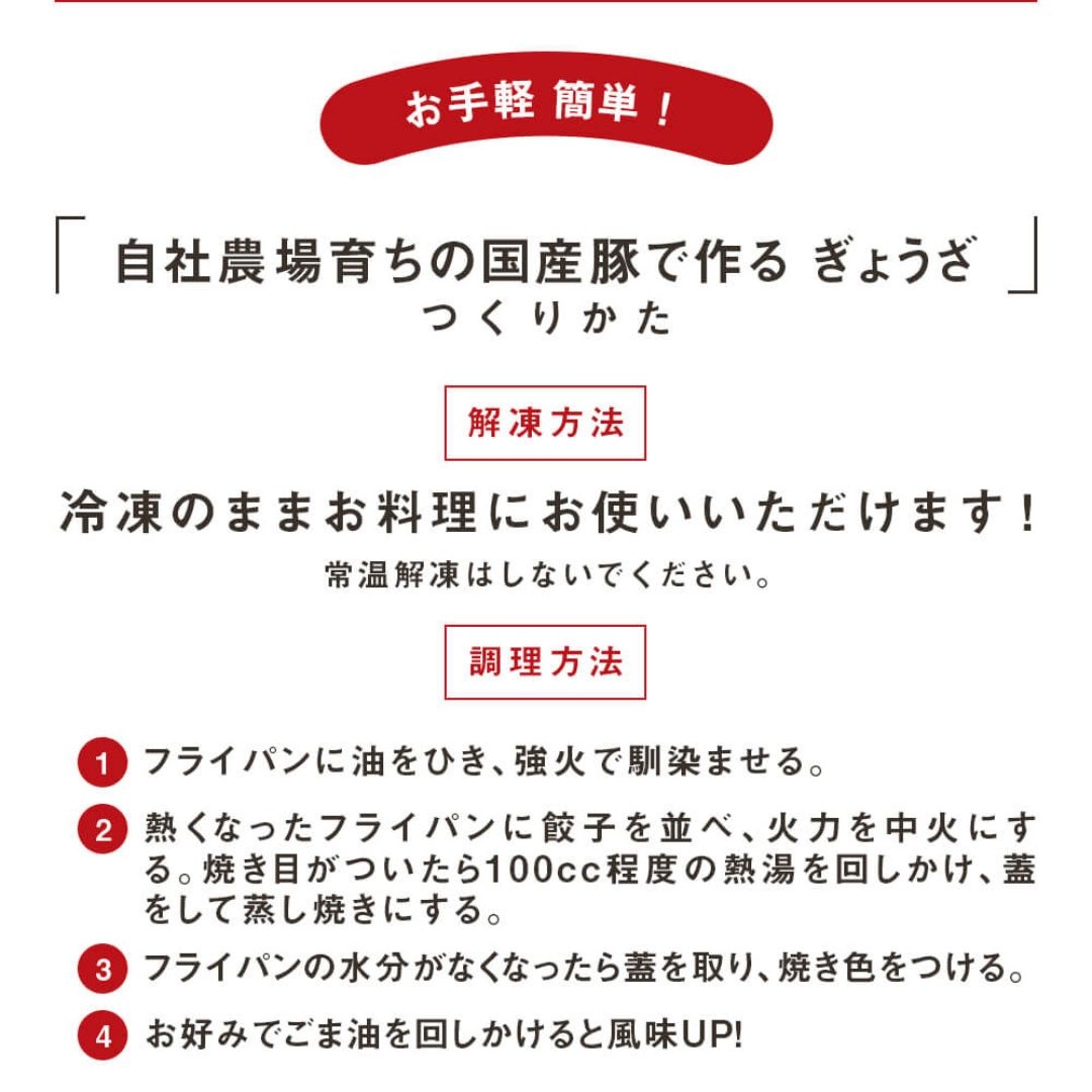 公式サイトより5%OFF!自社農場育ちの国産豚と新鮮な国産野菜を使用した餃子。 冷凍のまま焼くだけでお召し上がりいただける簡単調理の一品です。 食卓のメインに、ちょっとしたおやつなどにもおすすめです。