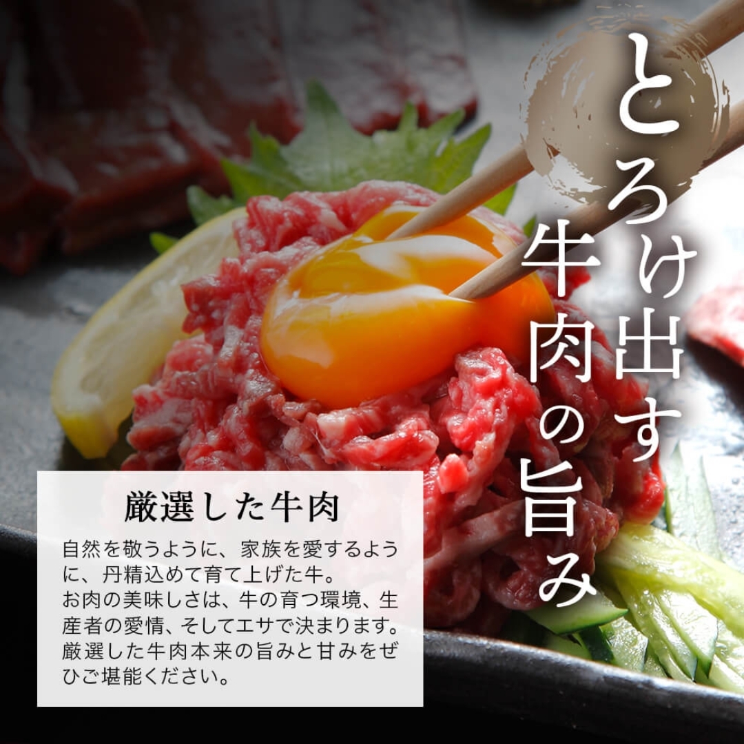 肉本来の旨みを楽しめる牛ユッケをご自宅でお楽しみいただけます。