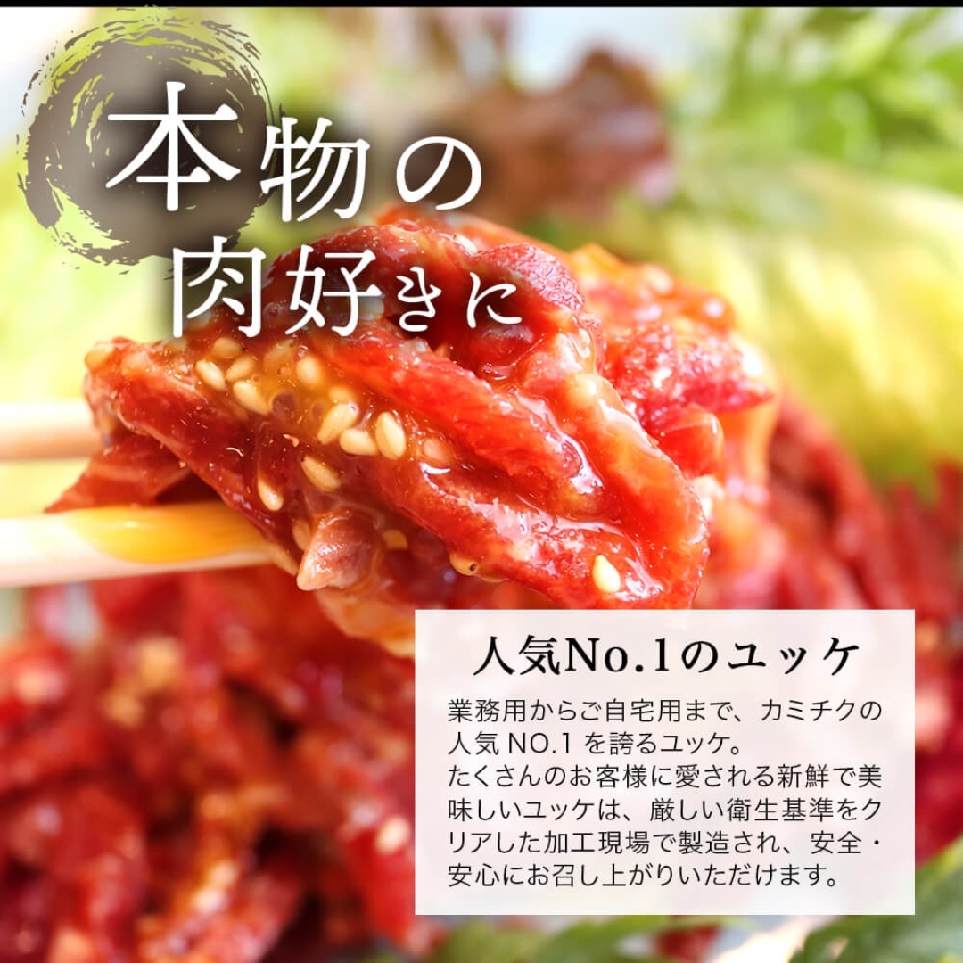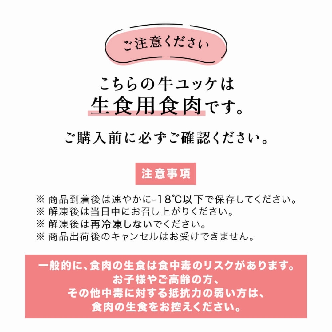【ユッケに関するご注意】 1. 一般的に食肉の生食は食中毒のリスクがあります。小さなお子様、ご高齢の方、食中毒に抵抗力の弱い方はお控えください。 2. 本商品は一般消費者向けに販売しております。 3. 商品到着後は速やかに-18℃以下で保存してください。 4. 解凍後は即日お召し上がりください。 5. 一度解凍した商品の再冷凍は絶対にされないでください。 6. 商品発送後のキャンセルはお受けできません。 7. 検査不合格だった場合は、再度製品を作り直し、再検査を行ないます。 商品到着までお待たせしてしまう場合がございますが、ご了承くださいますようお願い申し上げます。