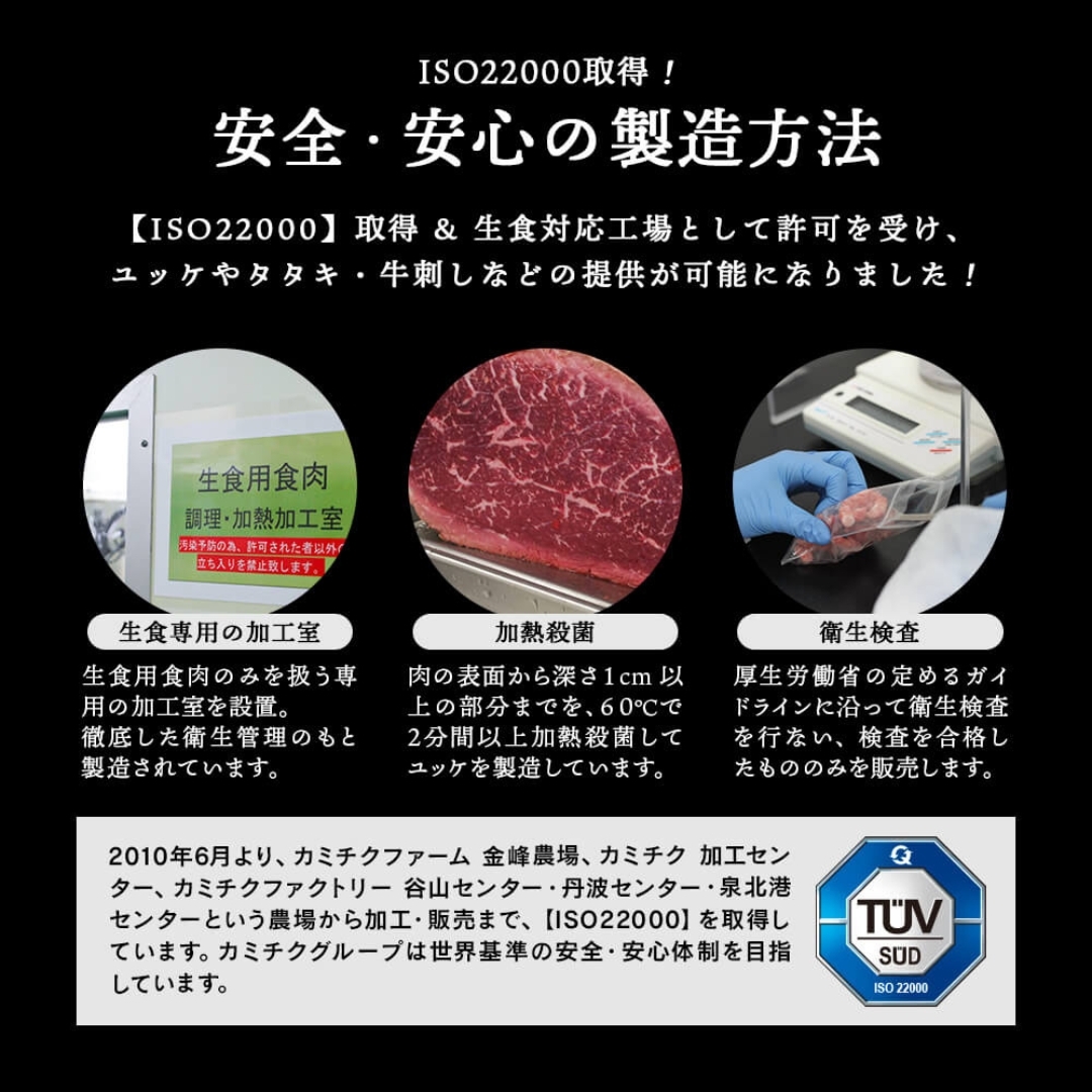ISO22000認証取得の生食認定自社工場で製造された安全・安心の牛ユッケ。