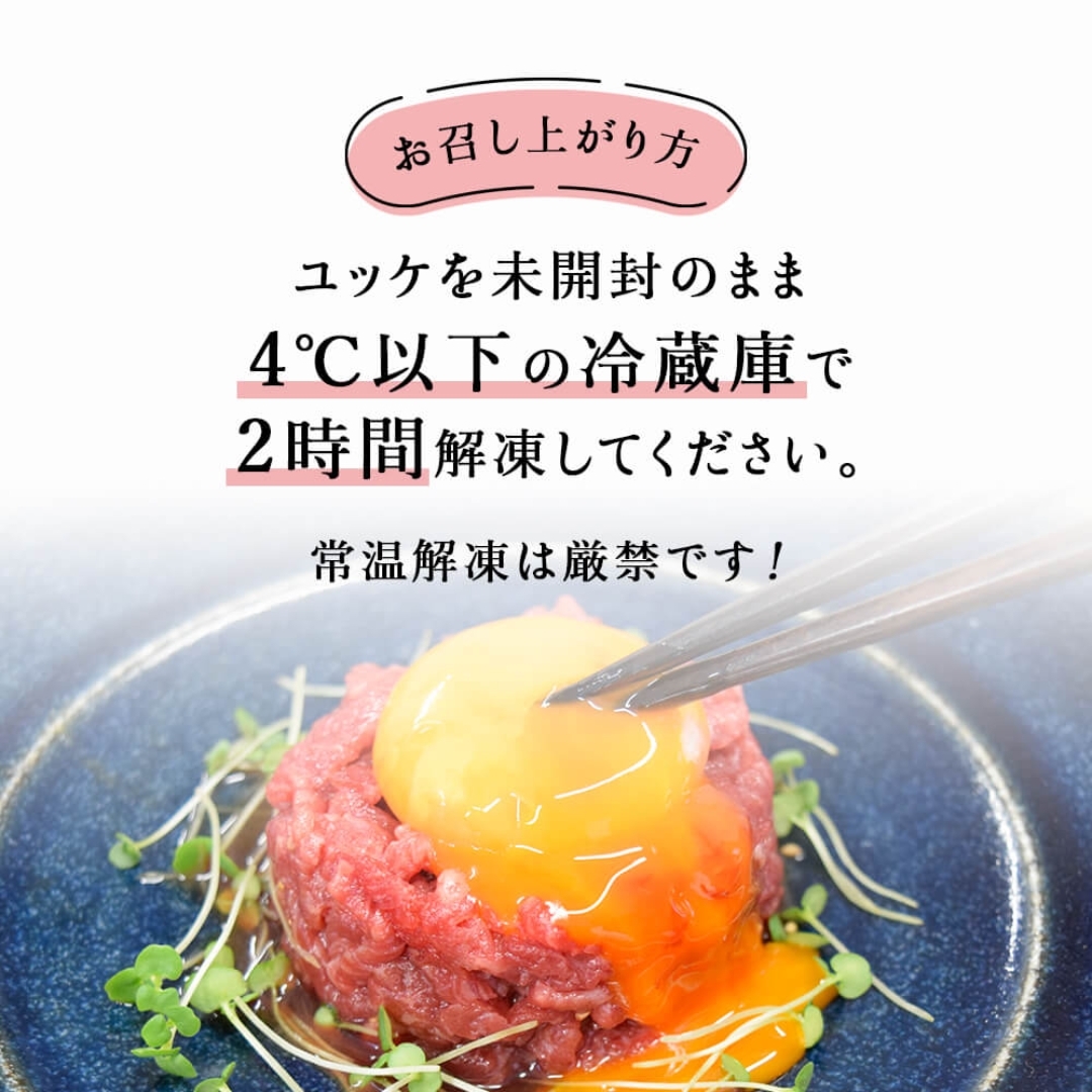 【ユッケに関するご注意】 1. 一般的に食肉の生食は食中毒のリスクがあります。小さなお子様、ご高齢の方、食中毒に抵抗力の弱い方はお控えください。 2. 本商品は一般消費者向けに販売しております。 3. 商品到着後は速やかに-18℃以下で保存してください。 4. 解凍後は即日お召し上がりください。 5. 一度解凍した商品の再冷凍は絶対にされないでください。 6. 商品発送後のキャンセルはお受けできません。 7. 検査不合格だった場合は、再度製品を作り直し、再検査を行ないます。 商品到着までお待たせしてしまう場合がございますが、ご了承くださいますようお願い申し上げます。