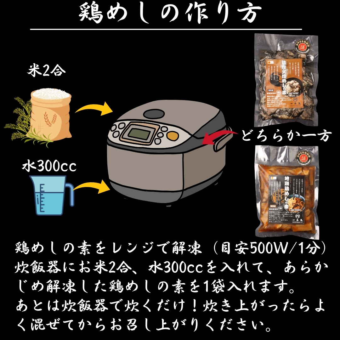 【地頭鶏めしの素】鶏肉、鶏油、塩、アミノ酸
