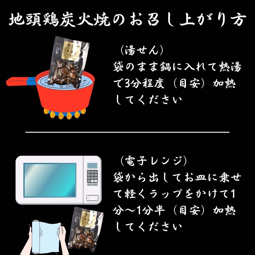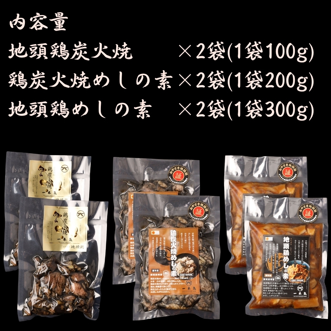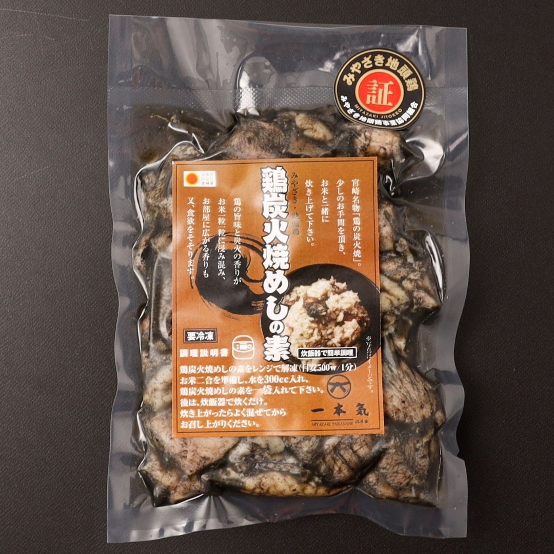 やわらかさとジューシーな味わいを存分に楽しめる地頭鶏炭火焼と、鶏の旨味が染み込んだ鶏炭火焼めしの素と地頭鶏めしの素をお届け!