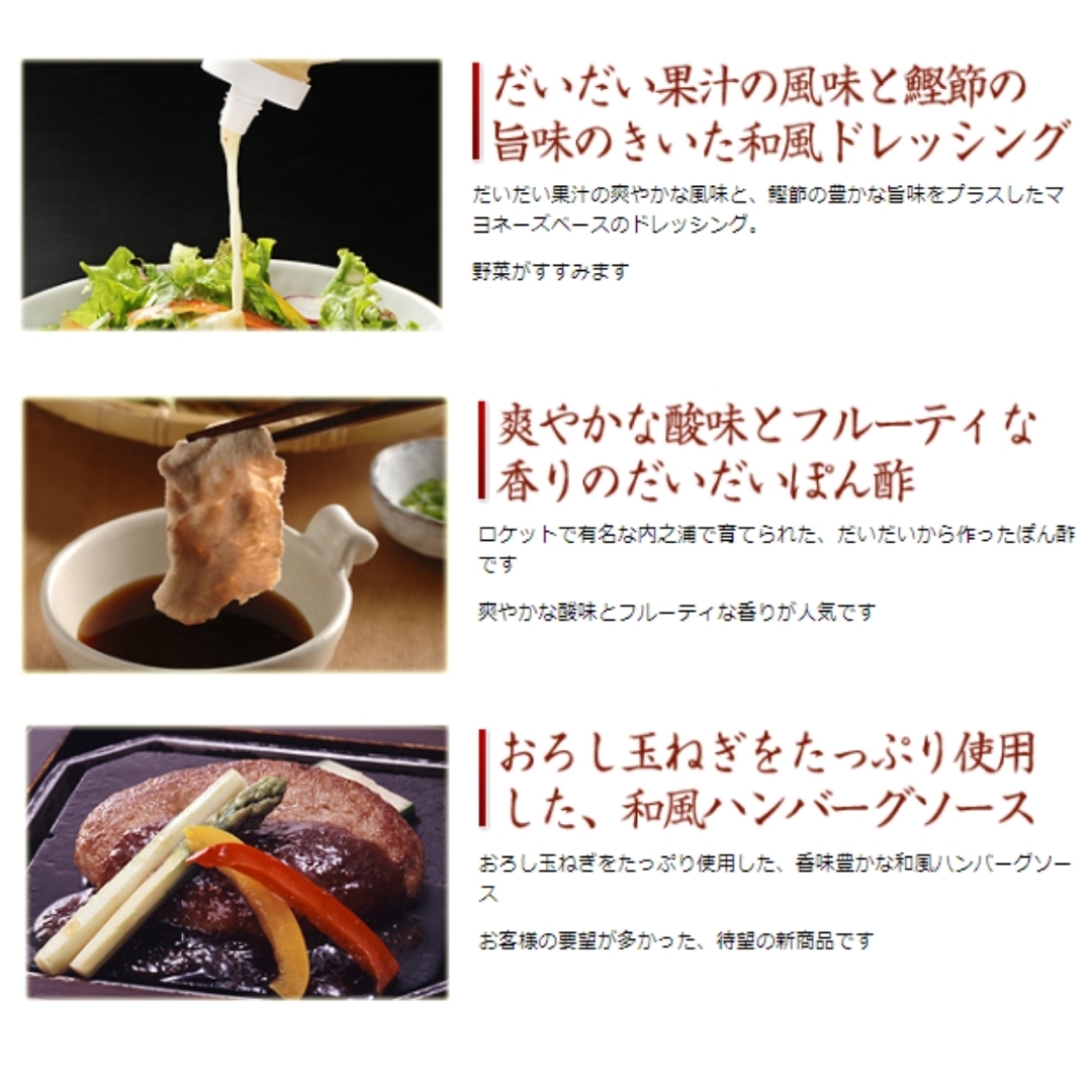 ロケットで有名な内之浦で育てられた、だいだいから作ったぽん酢。爽やかな酸味とフルーティな香りでお店では、黒豚しゃぶしゃぶにて一緒にご提供しています。おすすめの食べ方はお鍋・しゃぶしゃぶ等です。