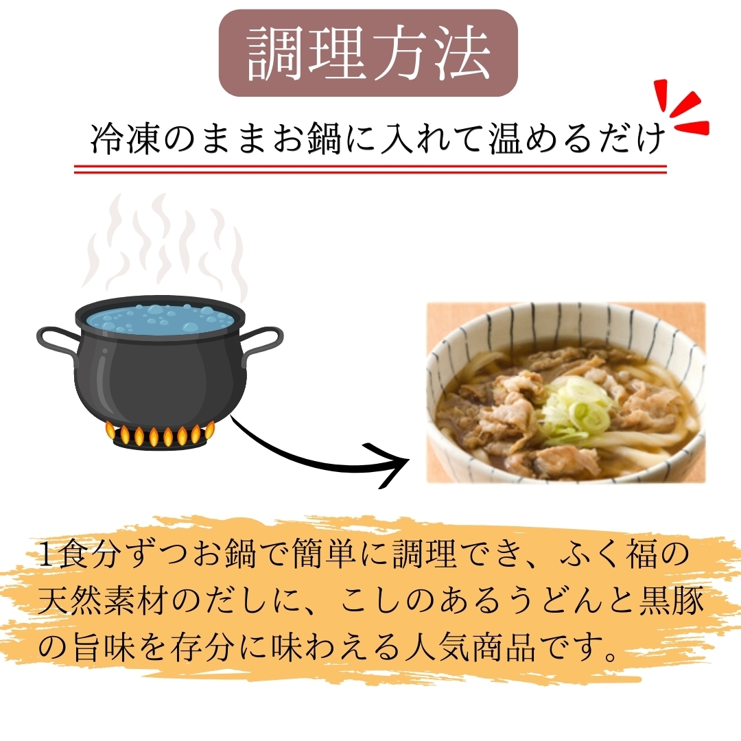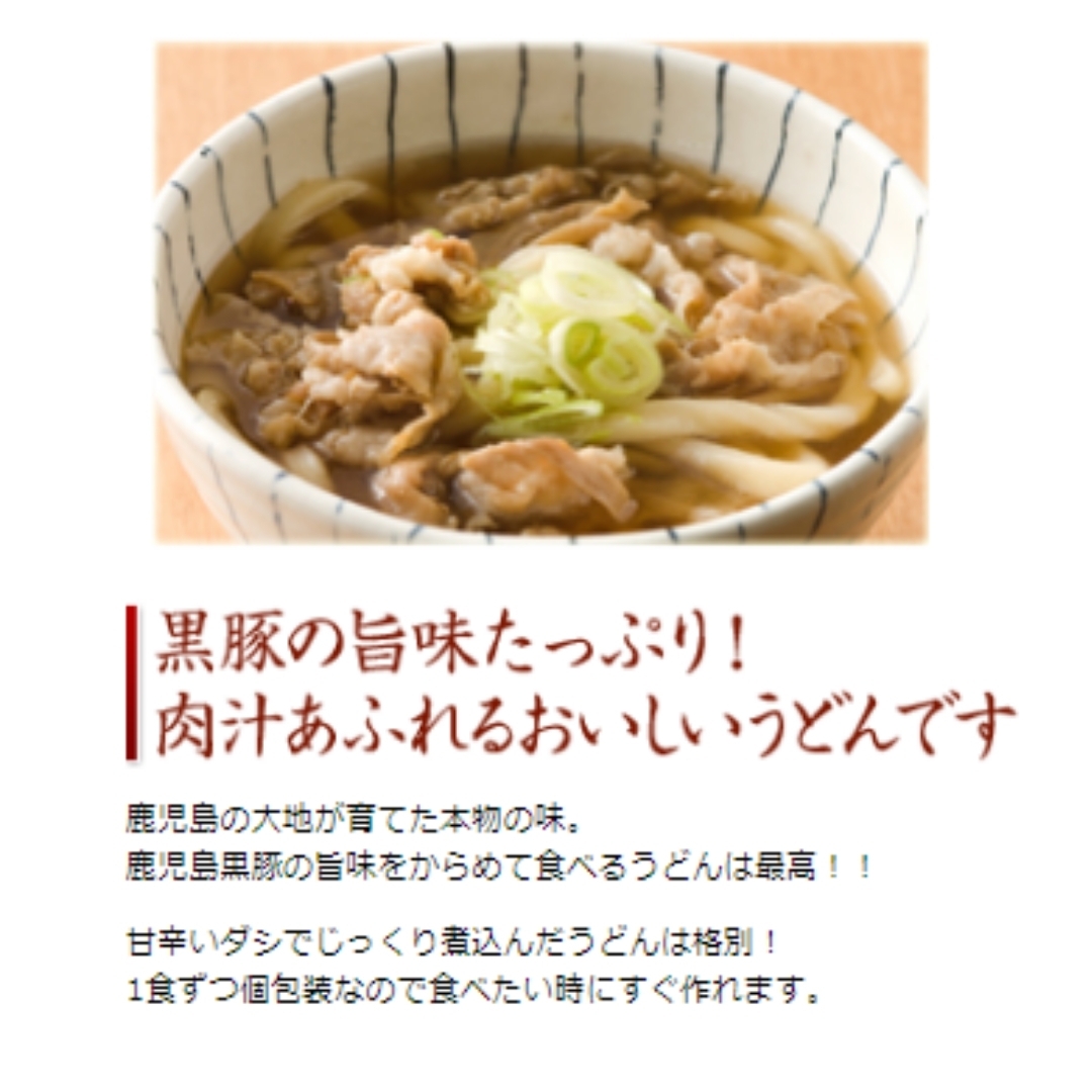 鹿児島県産の黒豚がたっぷり。一食分ずつお鍋で簡単に調理でき、自家製麺のこしのあるうどん、天然素材のだしにこだわったうどんつゆ、黒豚の旨味を存分に味わえる人気商品