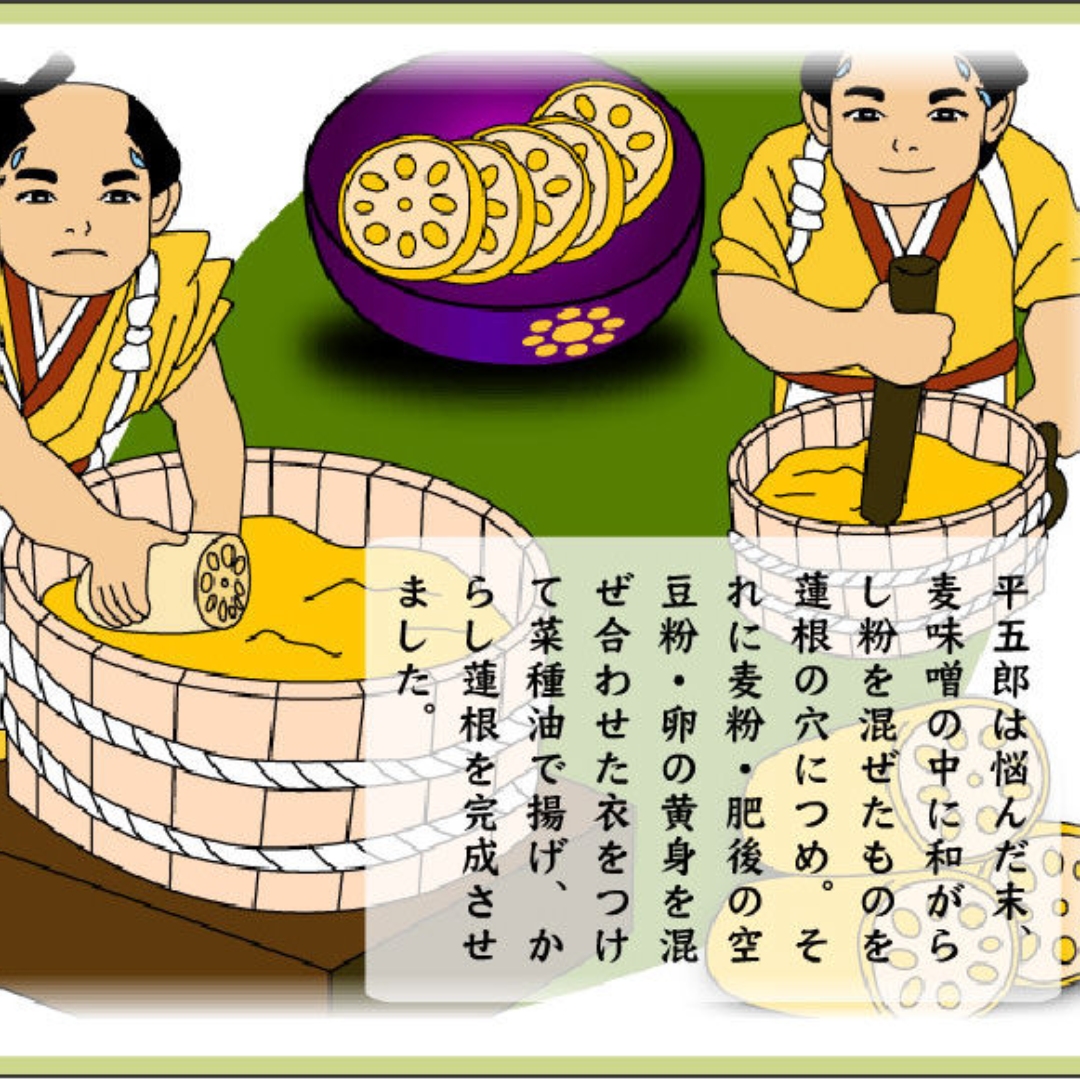 からし蓮根の元祖である当社のからし蓮根は、400年近く守り続けてきた手造り製法をそのままに継承しており、熊本名物の発祥の店です。