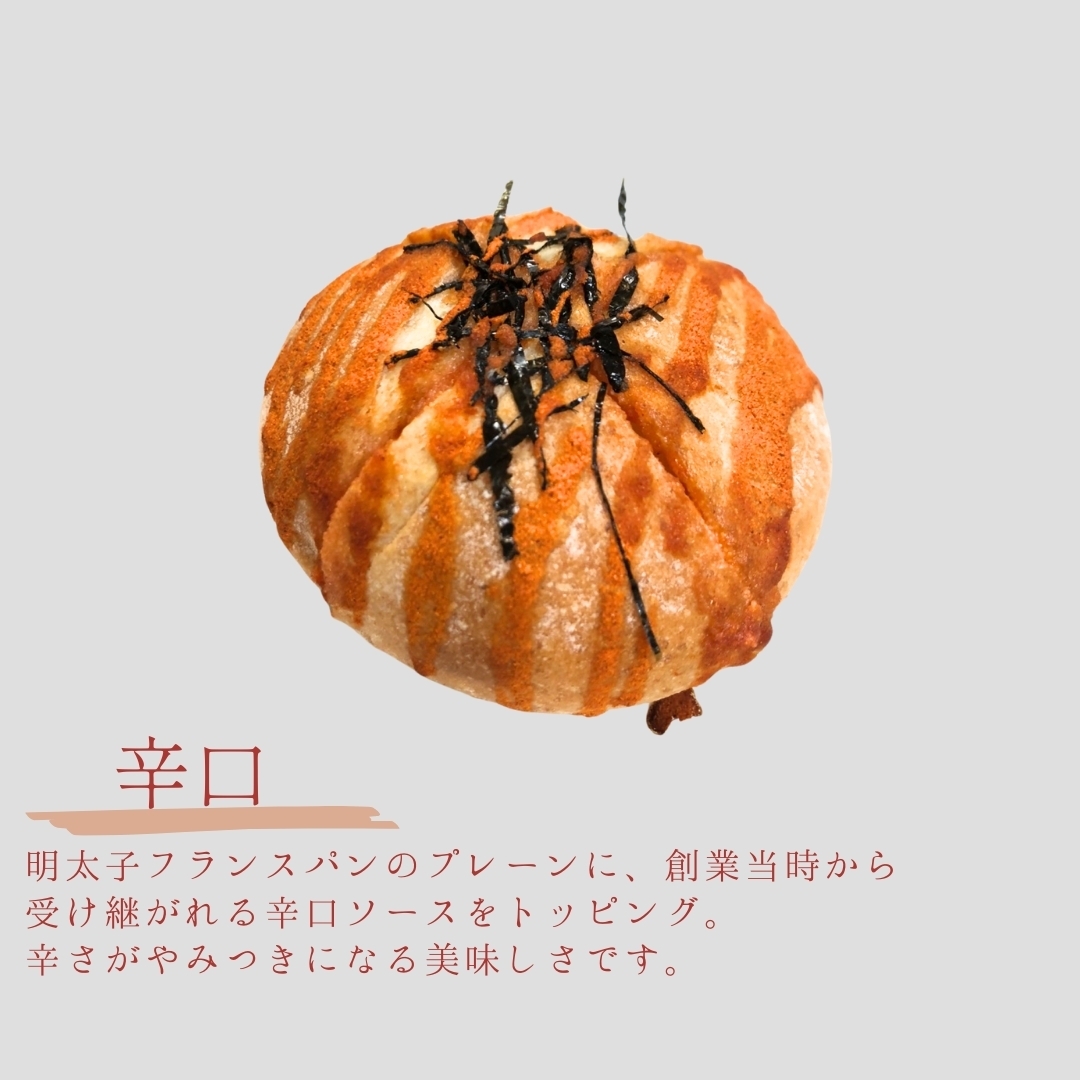 明太子フランスパンのプレーンに、創業当時から受け継がれる辛口ソースをトッピング。
