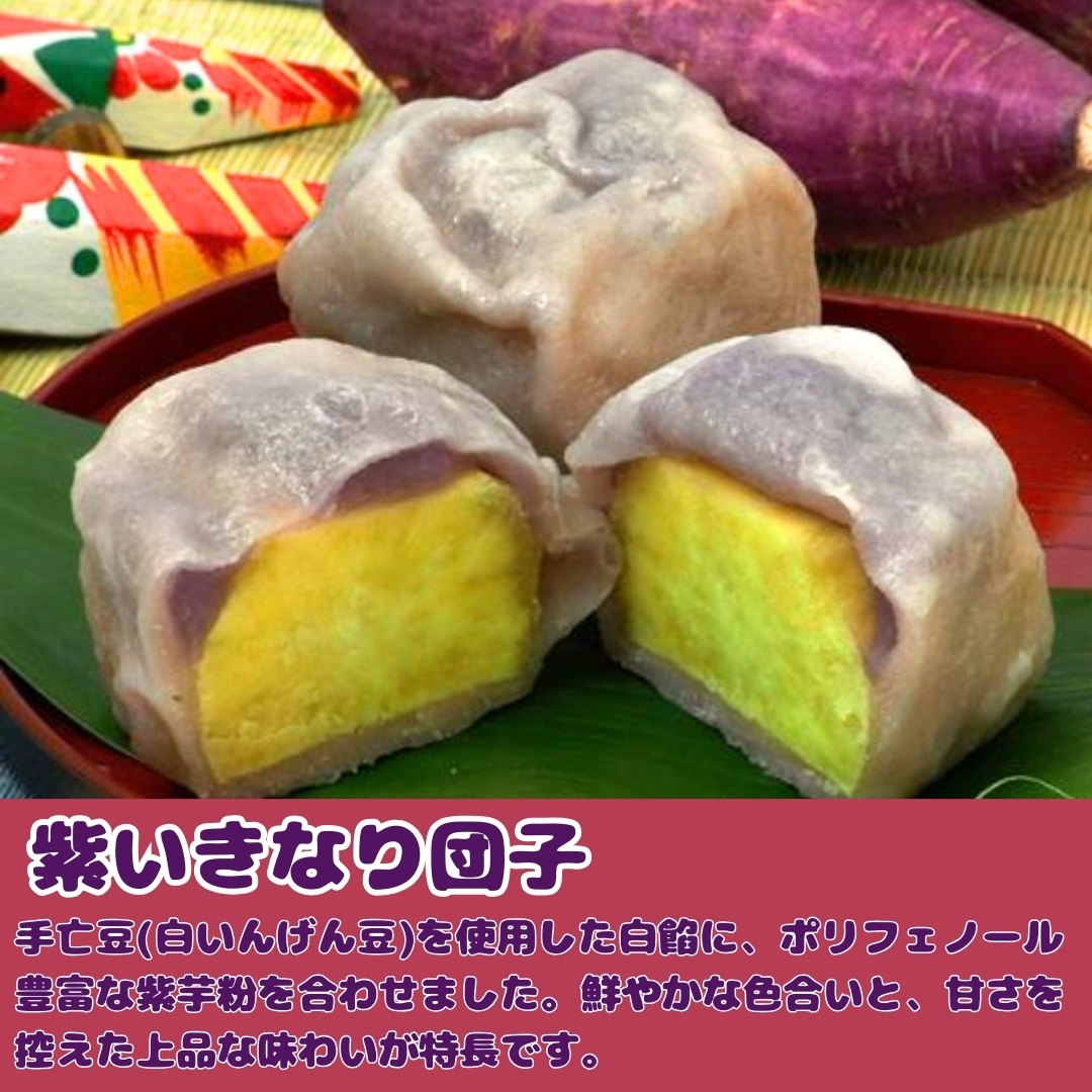 手亡豆(白いんげん豆)を使用した白あんに、ポリフェノールが豊富な紫芋粉を合わせた、見た目も美しい紫いきなり団子。いきなり団子本来のホクホク感やモチモチ感をそのままに、鮮やかな色合いと、甘さを控えた上品な味わいに仕上げました。