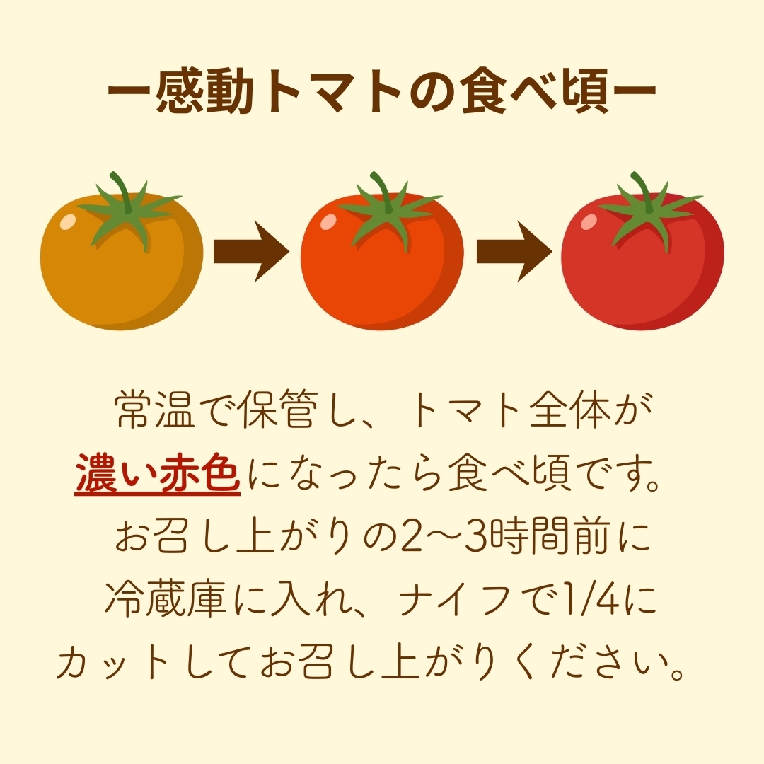 ひとつひとつにセンサーを通して糖度9度以上のトマトのみを選別し、 見た目の美しさはもちろん、最も味わいが凝縮される2S・3Sサイズのみを 「感動トマト」と名付けました。 硬めの食感で、まるでフルーツのような味わいをご賞味ください。