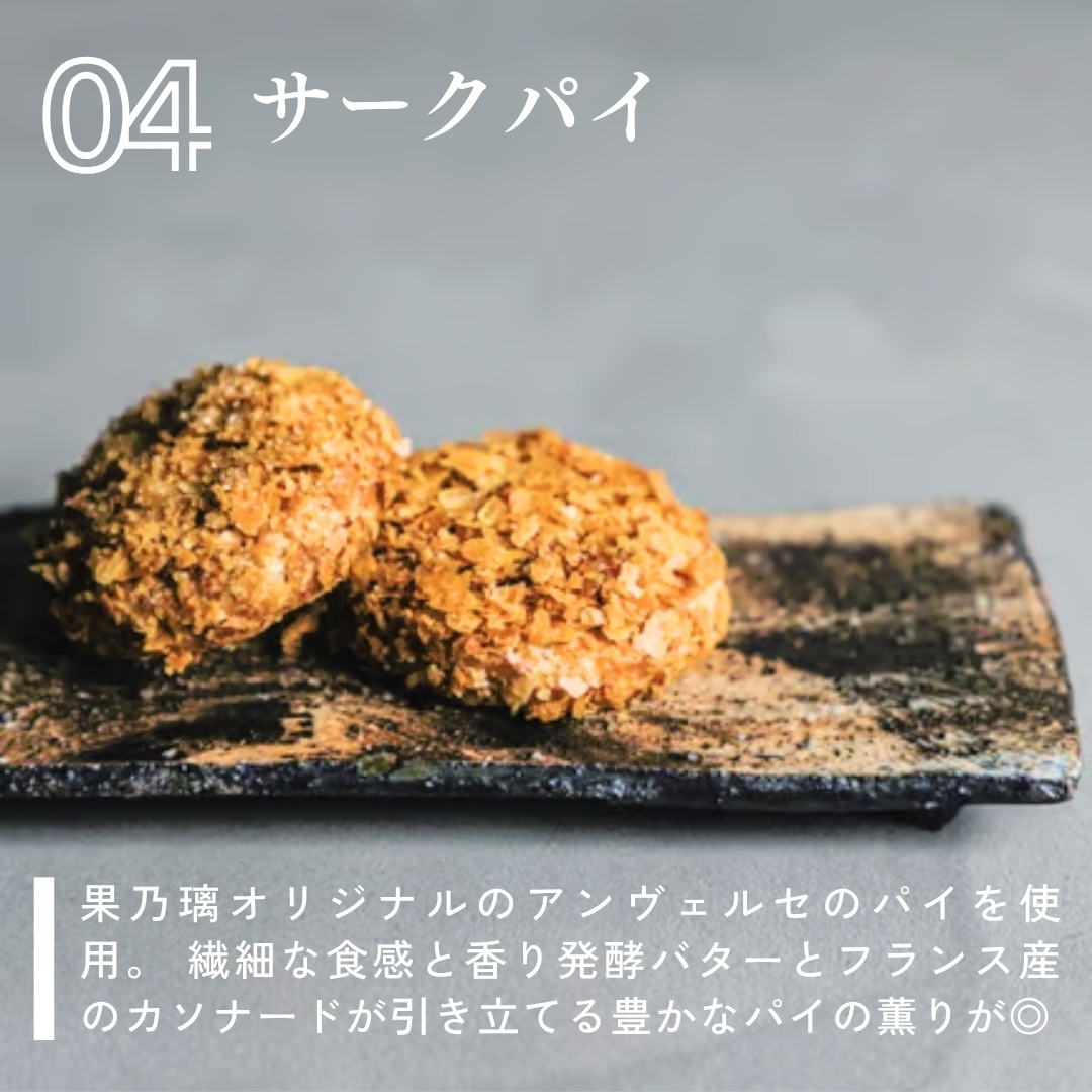 果乃璃オリジナルのアンヴェルセのパイを使用。繊細な食感と香り発酵バターとフランス産のカソナードが引き立てる豊かなパイの薫りが◎。