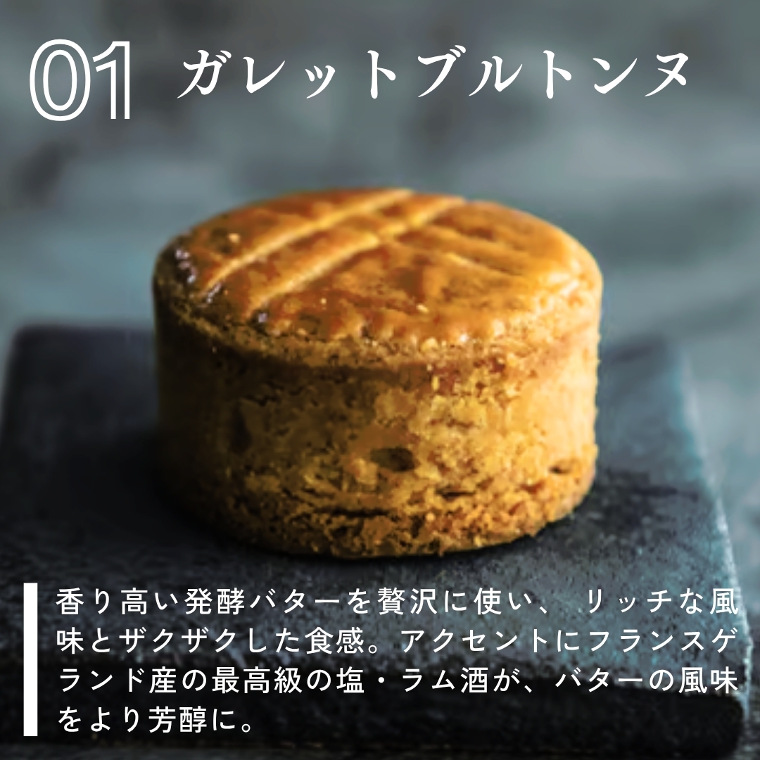 香り高い発酵バターを贅沢に使い、リッチな風味とザクザクした食感。アクセントにフランスゲランド産の最高級の塩・ラム酒が、バターの風味をより芳醇に。