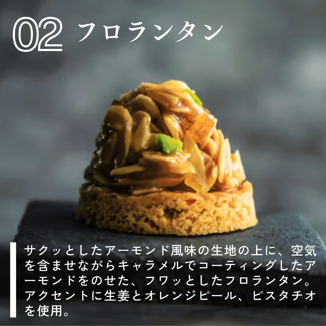 サクッとしたアーモンド風味の生地の上に、空気を含ませながらキャラメルでコーティングしたアーモンドをのせた、フワッとしたフロランタン。アクセントに生姜とオレンジピール、ピスタチオを使用。
