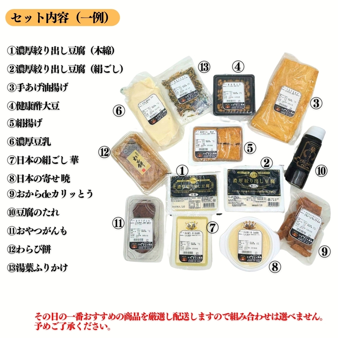 ・豆腐屋が厳選したお豆腐や湯葉、豆乳や厚揚げ等を8品から13品程度(約40種類の中から厳選します!)