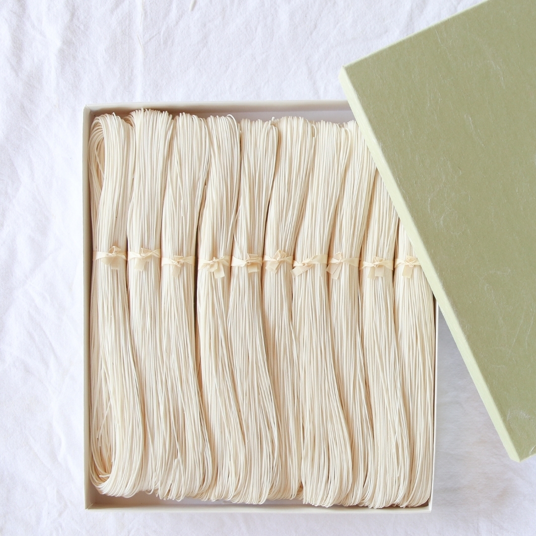 〇南関そうめん【曲げそうめん】 手延べで約3メートル程の細い麺を満遍なく作り出してから、専用の道具を使って束ねて形を整えた「曲げそうめん」。南関の手延べそうめんを象徴する商品です。お召上がり頂く際は、茹でる前に半分に折ってください。