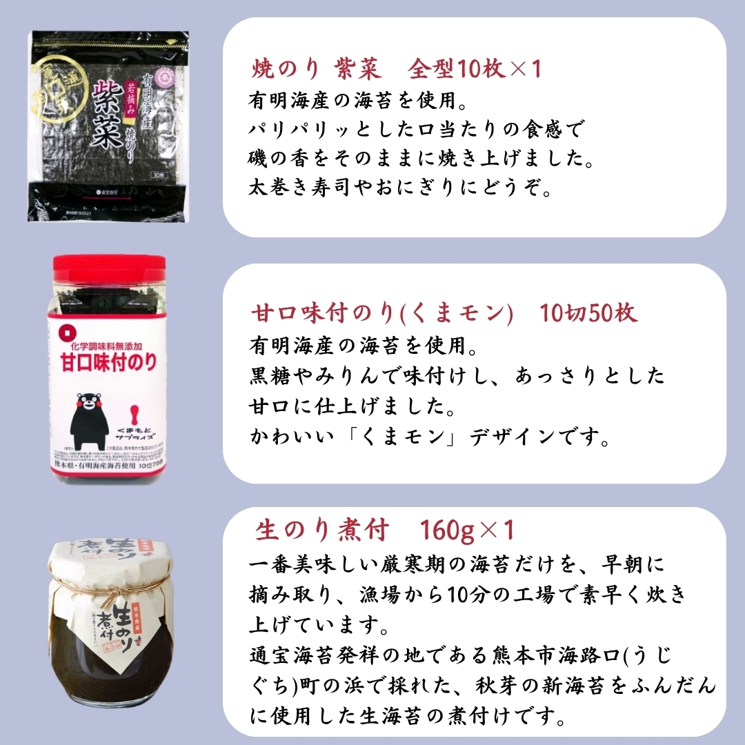 甘口卓上味付けのり(くまモン):乾のり( 熊本県・有明海産)、砂糖、しょうゆ( 大豆・小麦を含む)、黒糖蜜、果糖、みりん、発酵調味料、デキストリン、酵母エキス、食塩、加工黒糖、しょうゆ加工品、魚介エキス、煮干、焼きえび、かつお削りぶし、昆布、乾しいたけ、焼きあご( 飛魚)