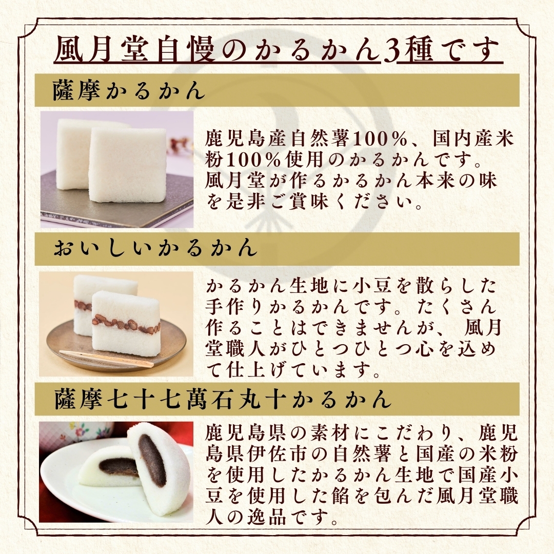 鹿児島県の素材にこだわり、鹿児島県伊佐市の自然薯と国産の米粉を使用したかるかん生地で国産小豆を使用した餡を包んだ風月堂職人の逸品です。
