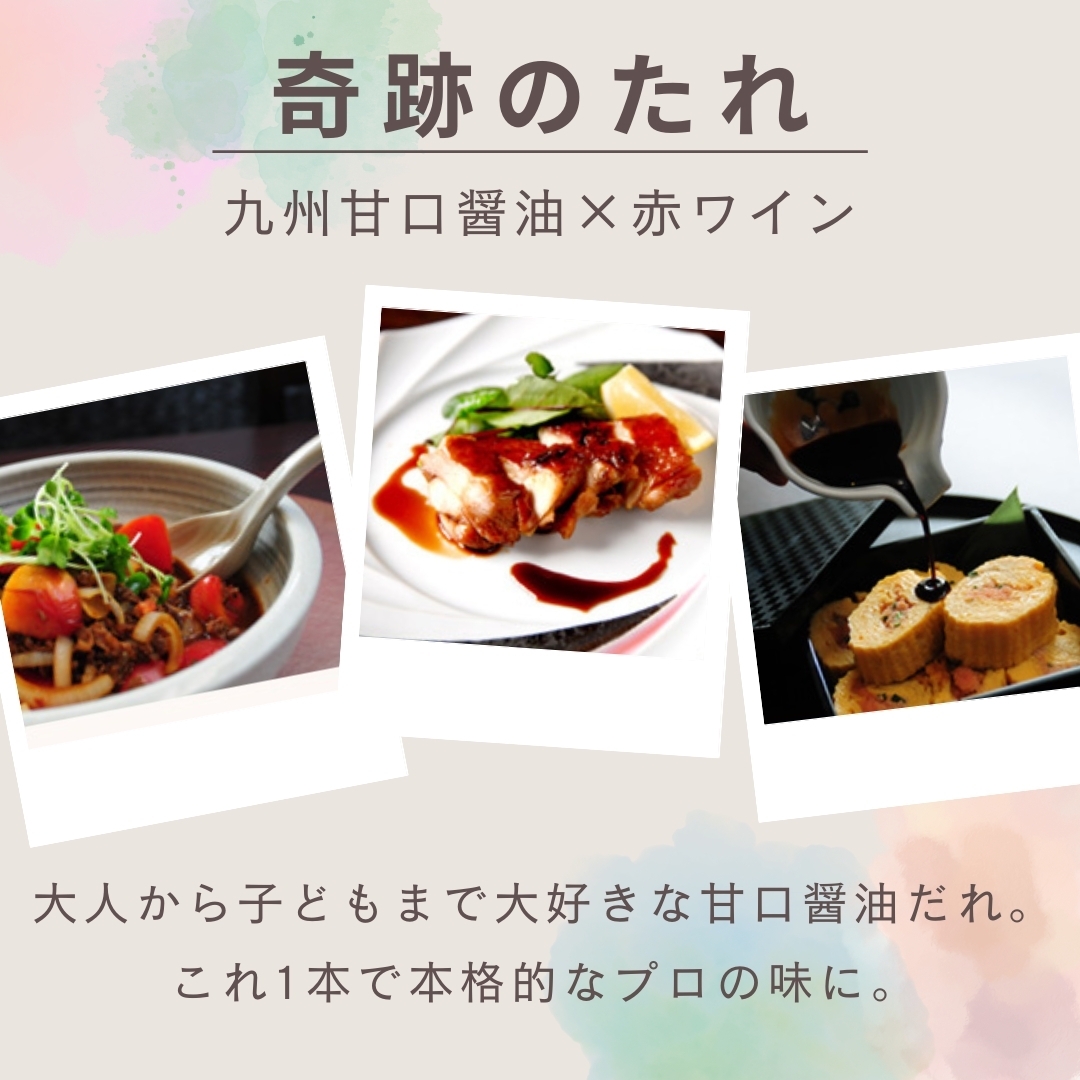 九州の甘口醤油と赤ワインをベースにコクと旨味が凝縮された万能醤油だれは、日本だけでなく海外の方も大好きなテリヤキ風味。 これ1本で味付けが決まる万能調味だれです。