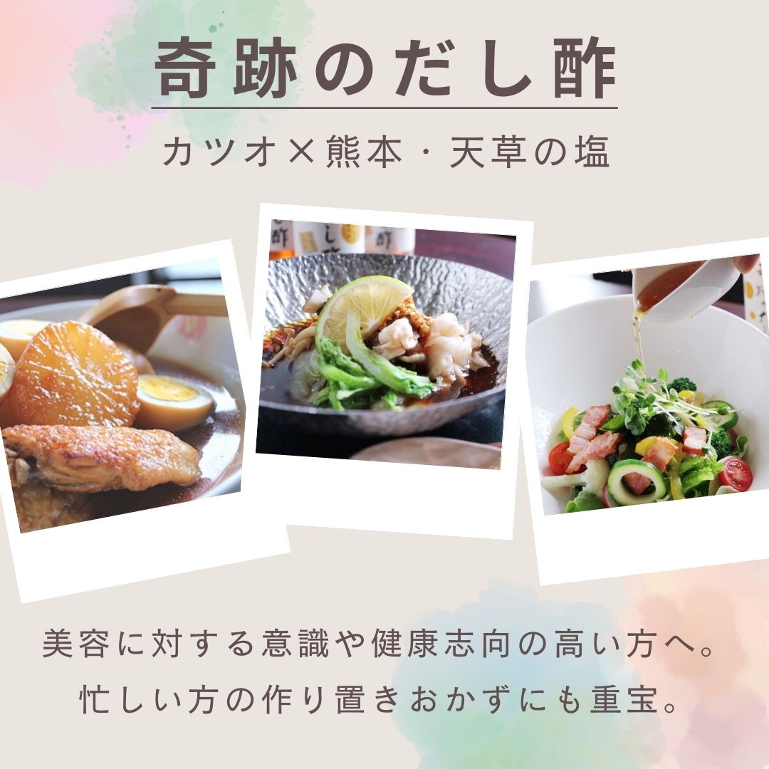 かつおの旨味、まろやかな酸味、アクセントに地元熊本・天草の塩を使い、濁りのない上品な琥珀色の万能調味酢を作りました。他にはないとっておきの味と香りです。