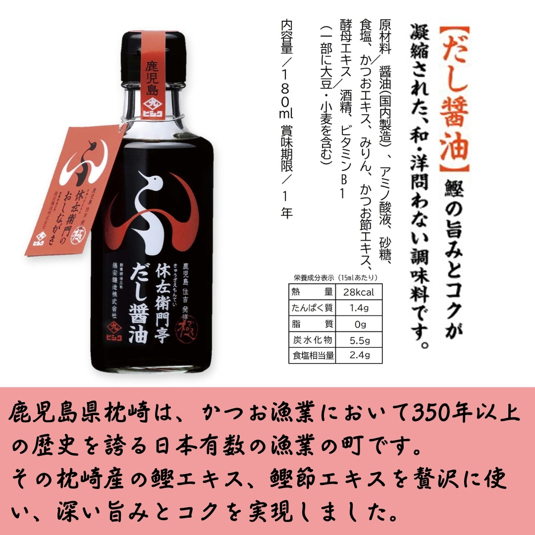 だし醬油:醤油(国内製造)、アミノ酸液、砂糖、食塩、かつおエキス、みりん、かつお節エキス、酵母エキス/酒精、ビタミンB1、(一部に大豆、小麦を含む)