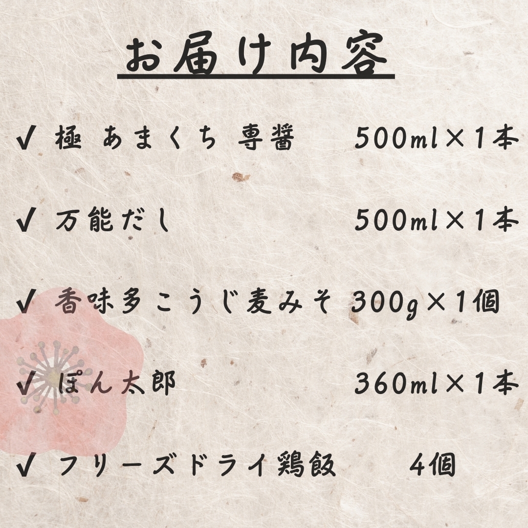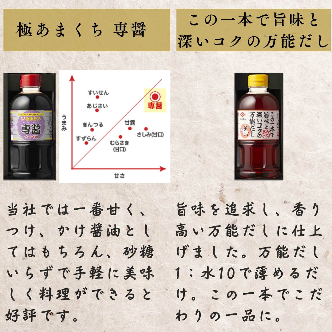 原材料等:しょうゆ(国内製造)、食塩、砂糖混合ブドウ糖果糖液糖、砂糖、米発酵調味料、かつお節エキス(かつお節、還元水あめ、かつおエキス、その他)、昆布エキス、発酵調味料、椎茸エキス/調味料(アミノ酸等)、酒精、ビタミンB1、(一部に大豆・小麦を含む)