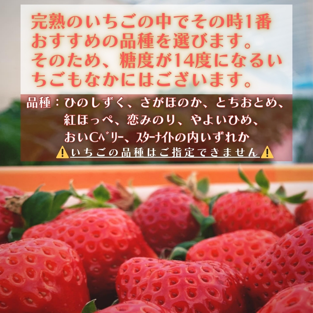 品種:ひのしずく、さがほのか、とちおとめ、紅ほっぺ、恋みのり、やよいひめ、おいCベリー、スターナイトの内いずれか1種※いちごの品種はご指定できませんので予めご了承ください。
