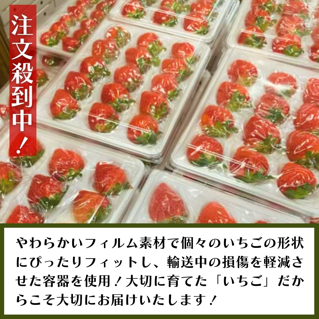 ※輸送中の損傷を軽減させるために、フィルム素材の個々のいちごの形状にぴったりフィットした容器を使用して発送致します。