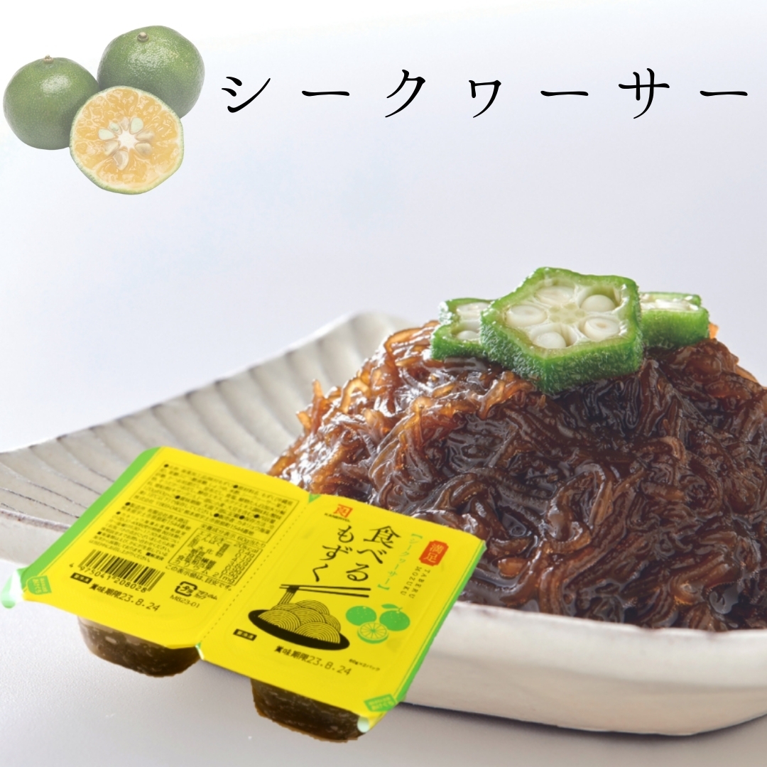沖縄県産の新鮮なもずくに、そうだがつお、かつお枯節、昆布の3種類のだしとホタテエキスの濃厚な旨味が加わった、上品な味わい、まろやかな酸味で食べやすく、汁が少なめでもずくをしっかり堪能できる市販品では味わえない特別なもずく酢です。シークヮーサー果汁を使用し、香料不使用で仕上げたシークヮーサー味の2種類をお楽しみいただけます。