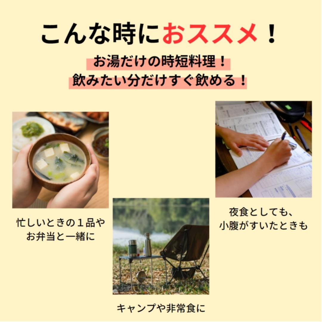 備考:中身をお椀に入れ、熱湯をお椀8分目(約160CC)まで注ぎ、よくかき混ぜてください。お好みによりお湯の量を加減してください。熱湯の取り扱いには十分ご注意ください。開封した個包装は一度に使い切ってください。海藻類はえび、かにが生息している海洋から採取しております。