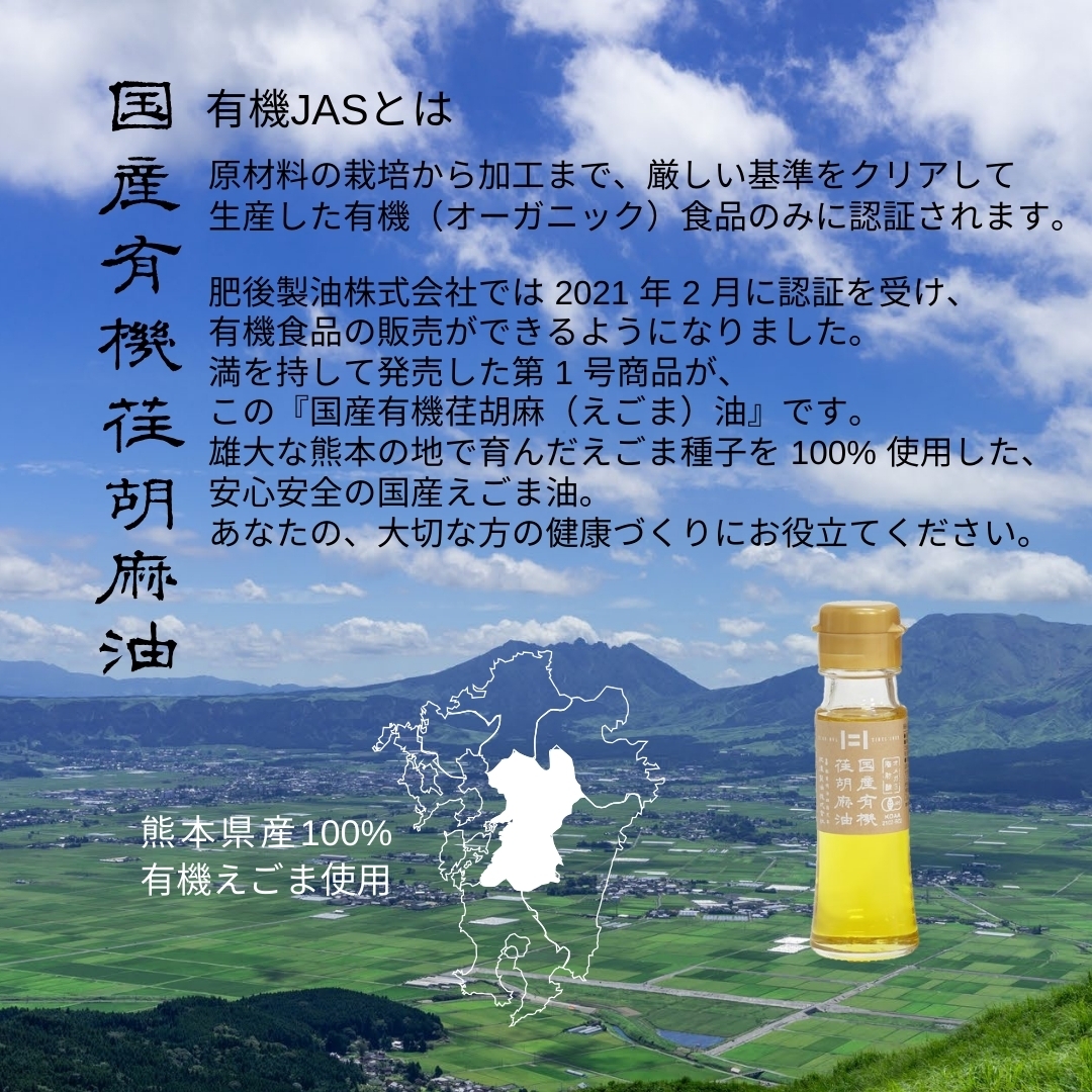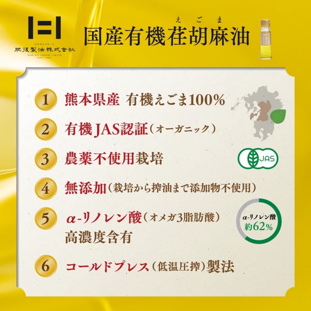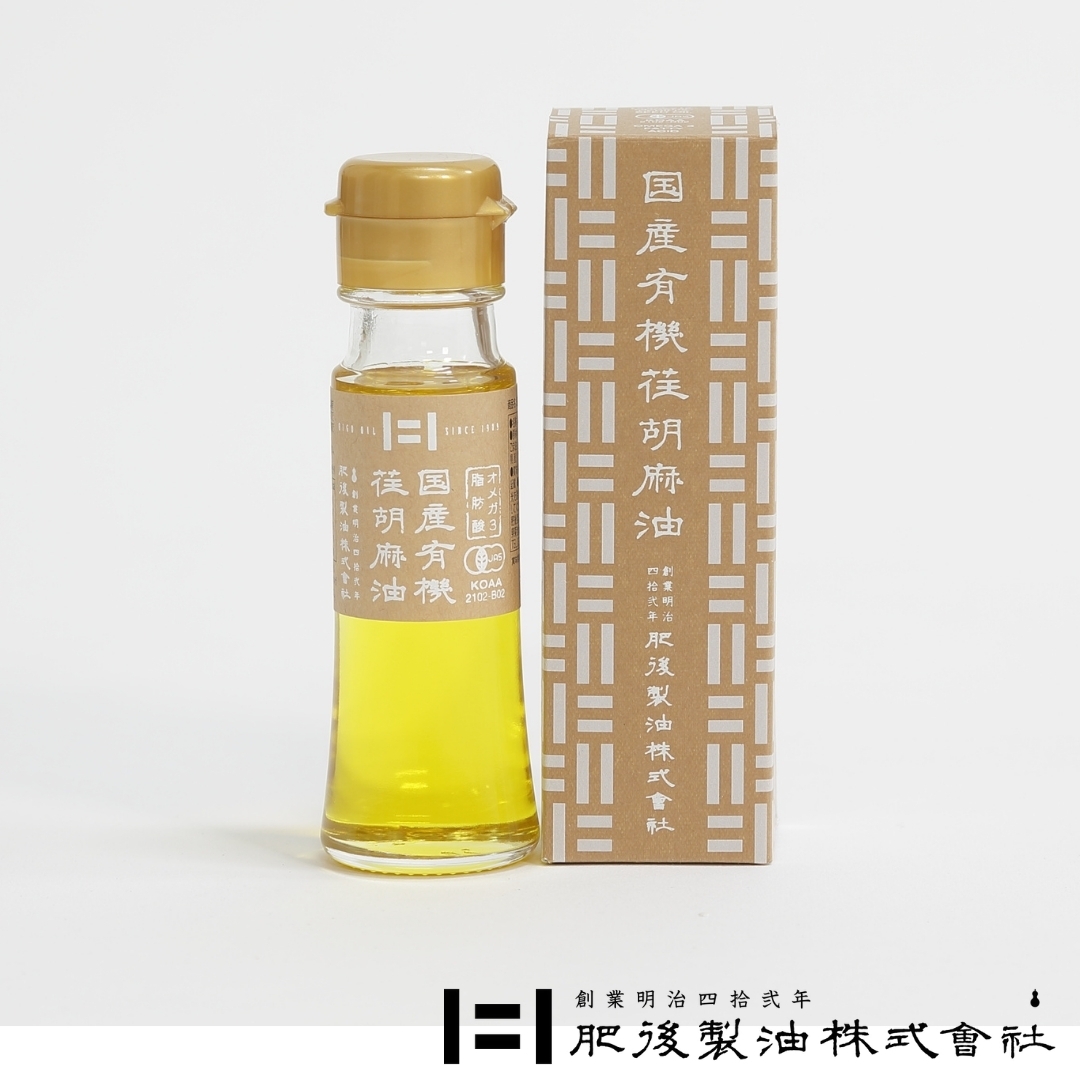 オメガ3脂肪酸(α-リノレン酸)を多く含んだ、えごま油です。健康的な食生活に欠かせない油として注目されております。無農薬・無化学肥料で栽培し、和紙を使用し圧力のみの昔ながらの製法で丁寧に搾油した貴重なえごま油です。熊本県産有機えごま種子のみ使用しています。