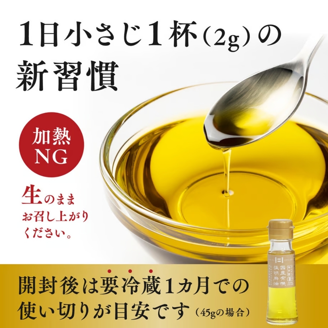 α-リノレン酸を60%以上含んでいる国産有機えごま油の摂取量は1日小さじ1杯でOK!