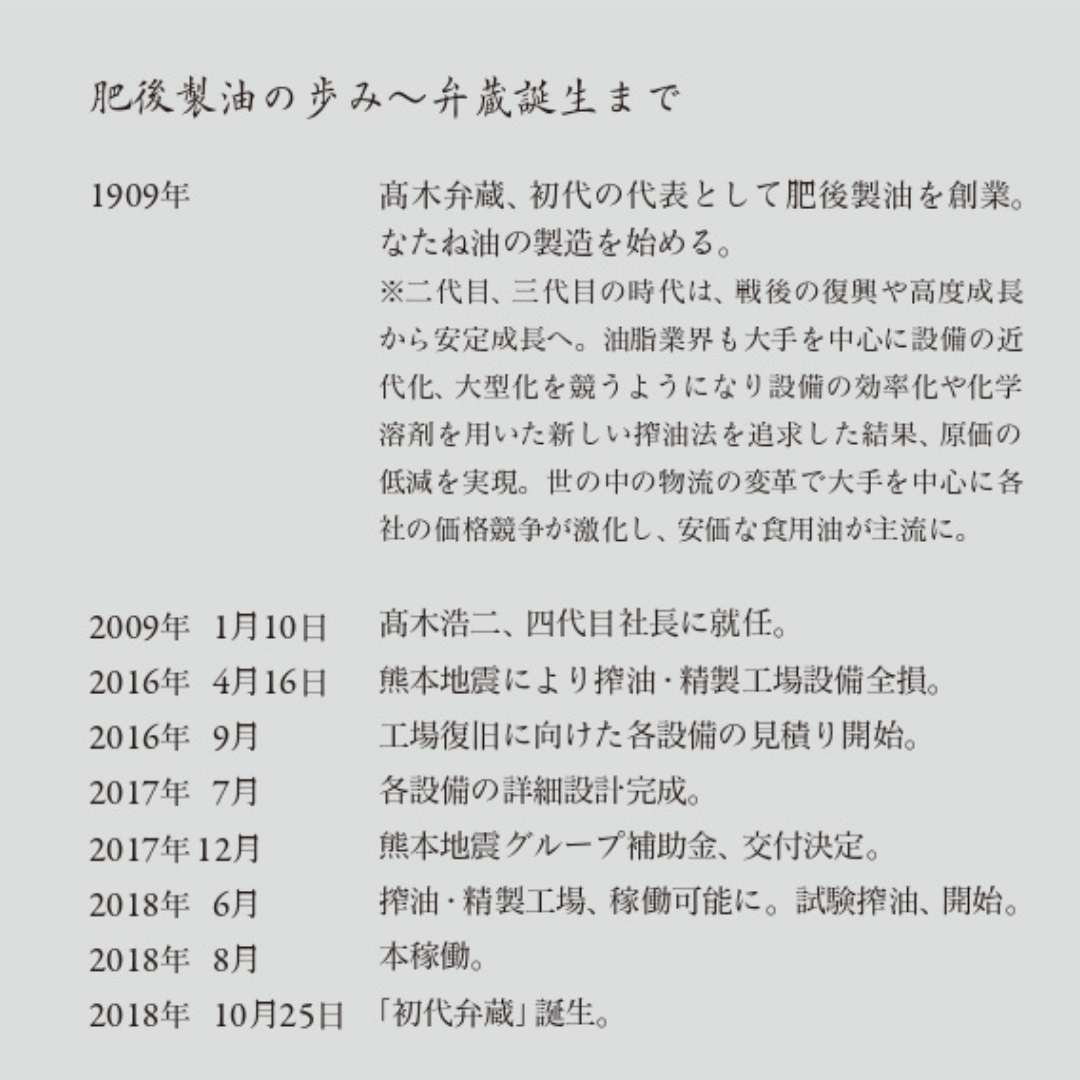 「初代弁蔵」は、国産菜種を低温でじっくり焙煎した、甘い香ばしさが味わえる菜種油です。職人が丁寧に昔ながらの一番搾り(圧搾製法)で、三日三晩手間ひまをかけて仕上げています。