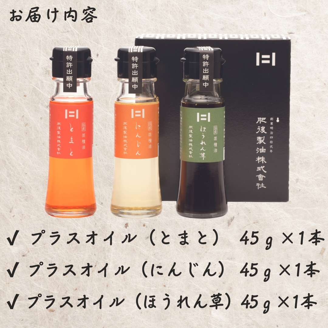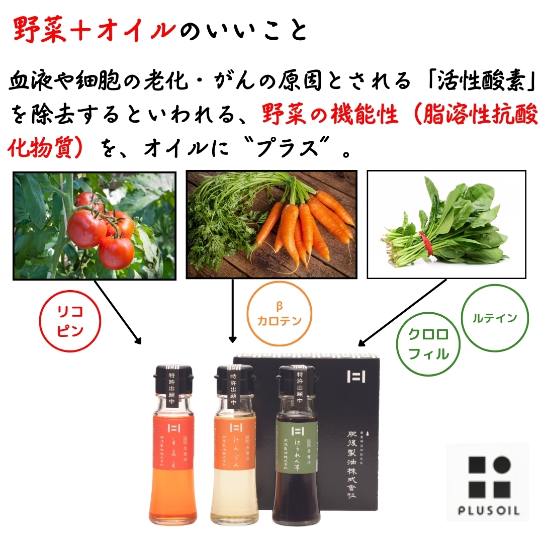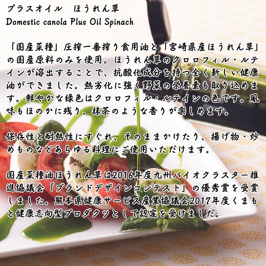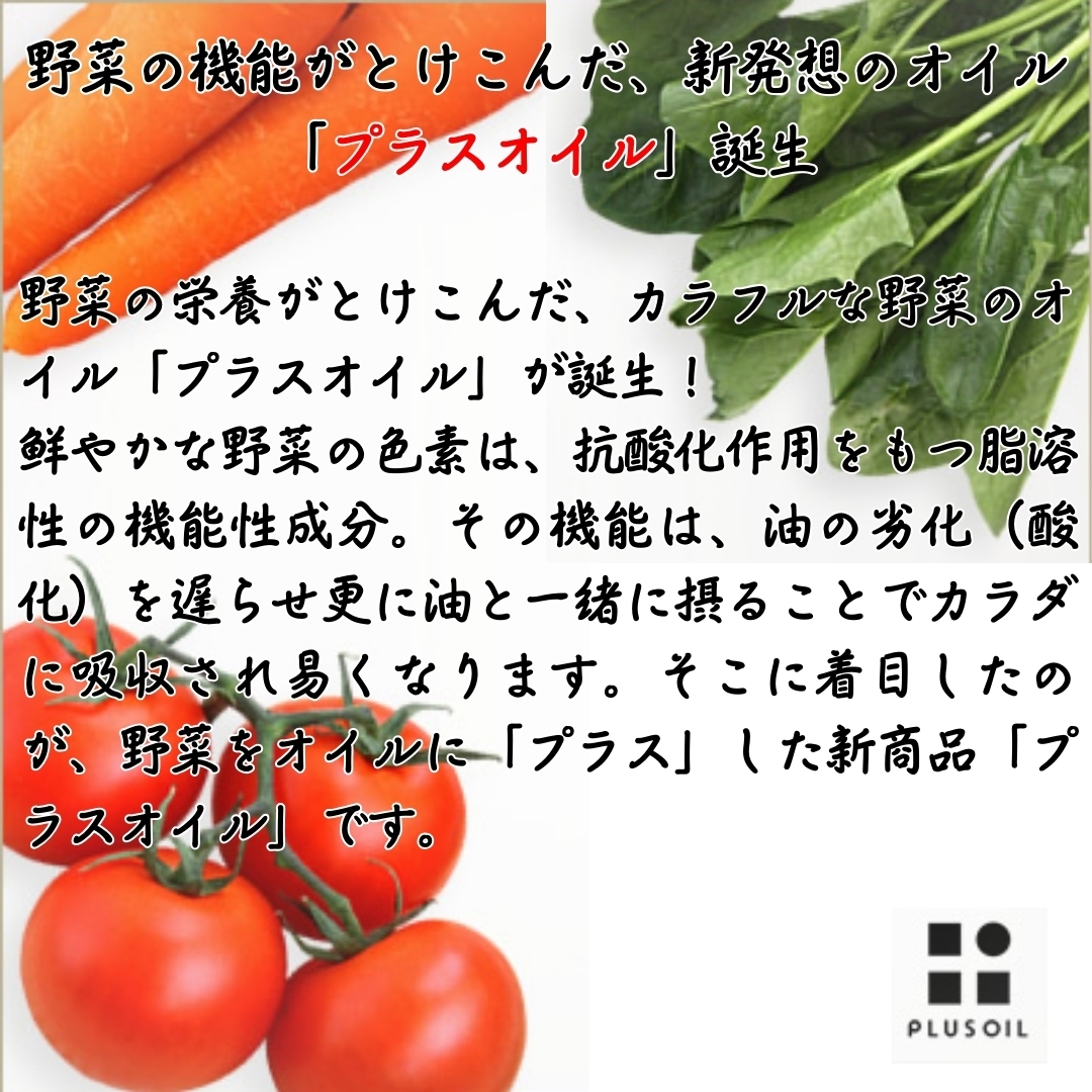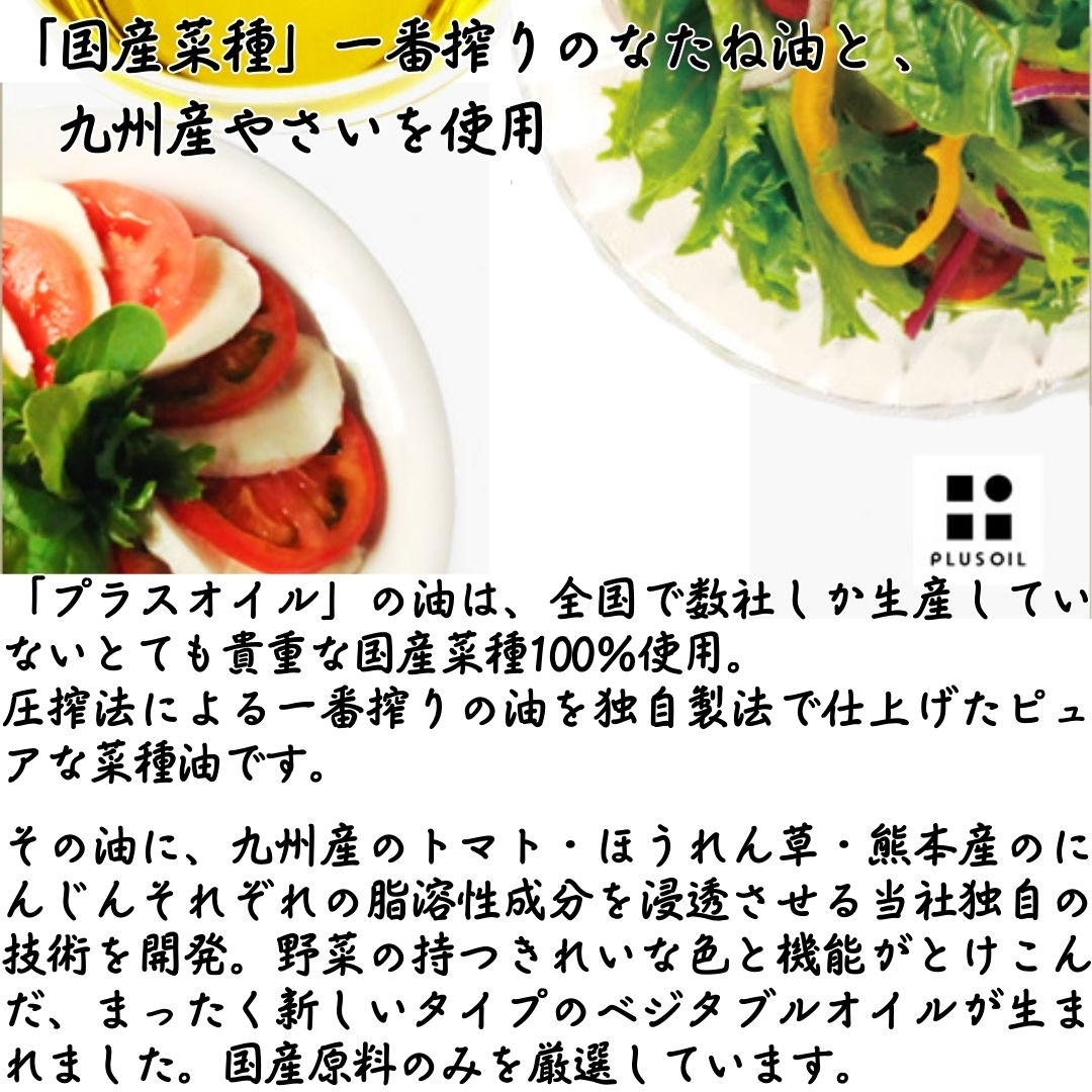 【プラスオイル6つの魅力】 <加熱に強い> 炒め油や揚げ油に使っても、そのまま食材にかけてもOK。オリーブオイルと同じように使えます。 <酸化しにくい> 野菜の力、カロテノイドが油に溶け出すことで油本来の抗酸化力がアップ。 <どんな料理にも幅広く使える> 味と香りがわずかなので他の食材のジャマをせず、ほんのり残る野菜の風味を楽しめます。 <カラフルな彩り> 色鮮やかな3色が食材に映えます。無添加無着色。自然の色素。 <野菜は全て九州産> とまとは九州産、にんじんは隣町(熊本県菊池郡菊陽町)熊本産、ほうれん草は宮崎産を主に使用。 <国産菜種100%> 貴重な国産菜種100%(JAS規格合格品)の油を使用。圧搾法による一番搾り。まろやかな風味が特徴。