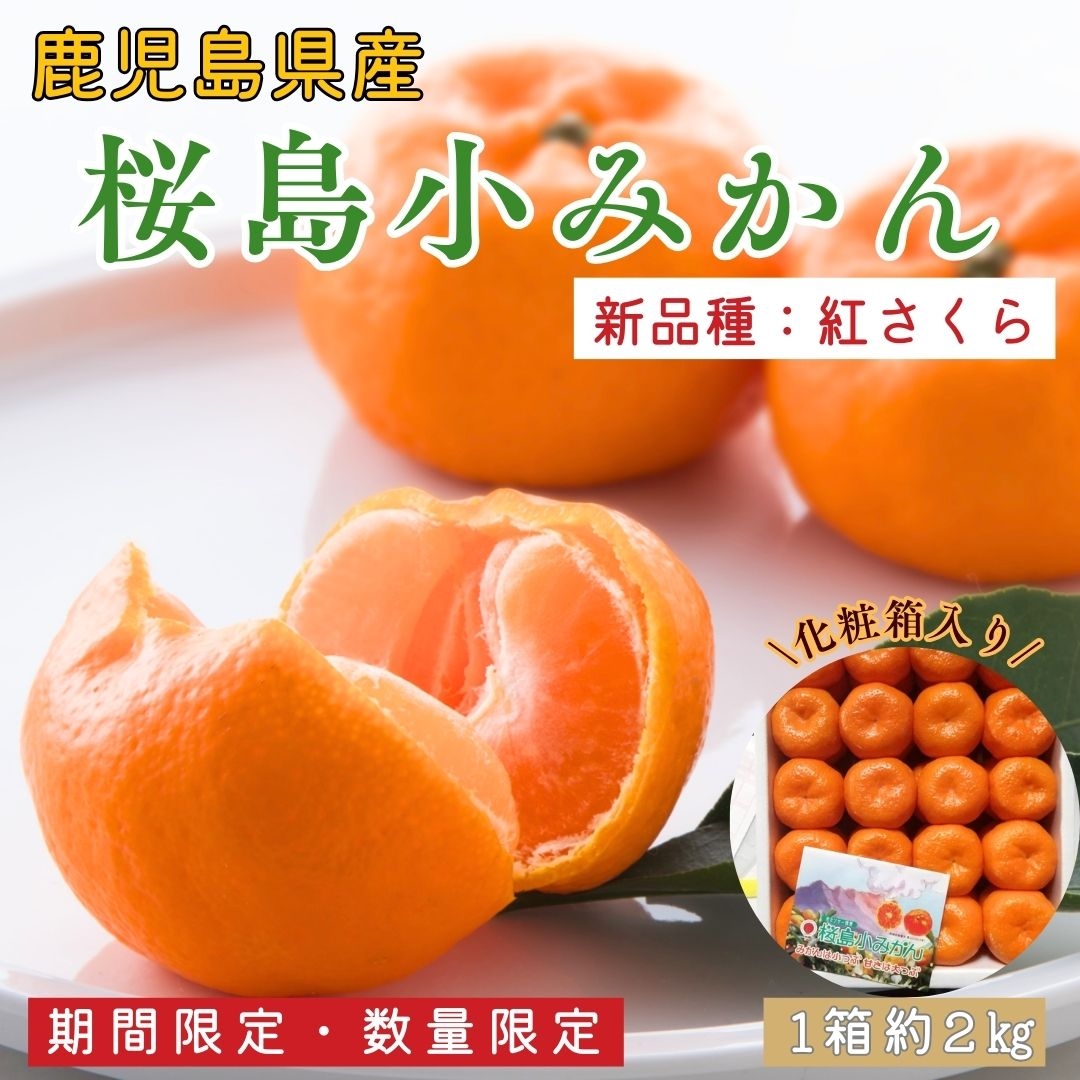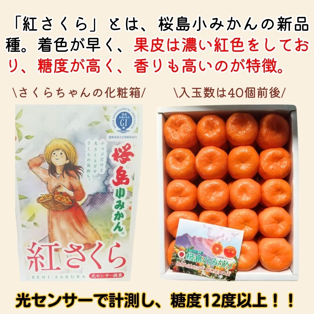 「紅さくら」とは、桜島小みかんの新品種。着色が早く、果皮は濃い紅色をしており、糖度が高く、香りも高いのが特徴。